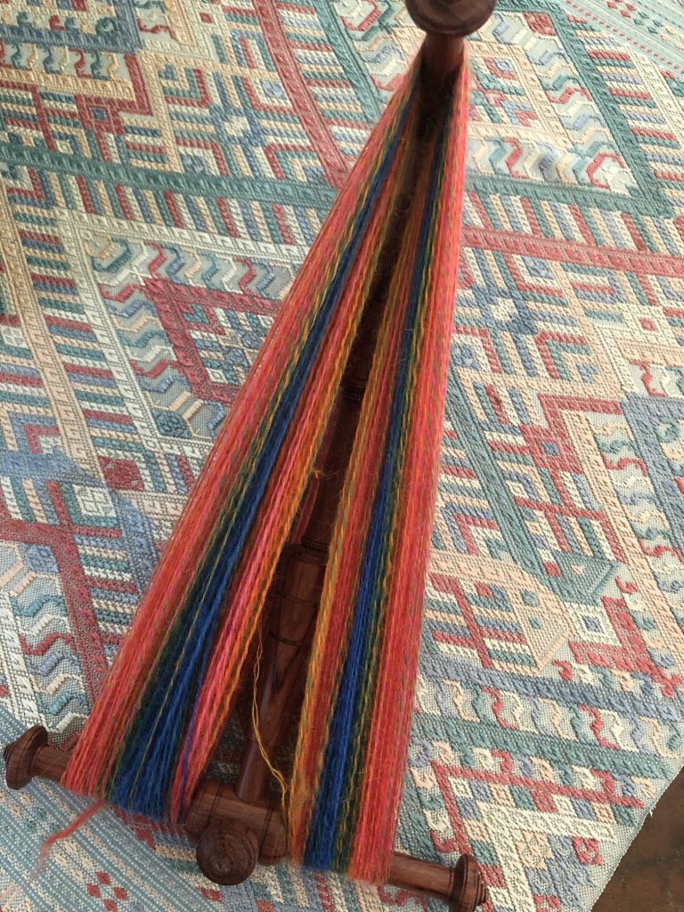Now that we are well into autumn, I find that I am no more focused or settled than I was in mid-summer. I am still spinning that silk stash. I’ve finished the face cloths and moved onto another ‘homey’ project of a long warp for eight kitchen towels. Kitchen towels? Truly, I am craving some simple luxuries. I got out my warp trapeze that Bob built for a much larger loom. It works quite well on my small Baby Wolf, and warping was a walk in the park!