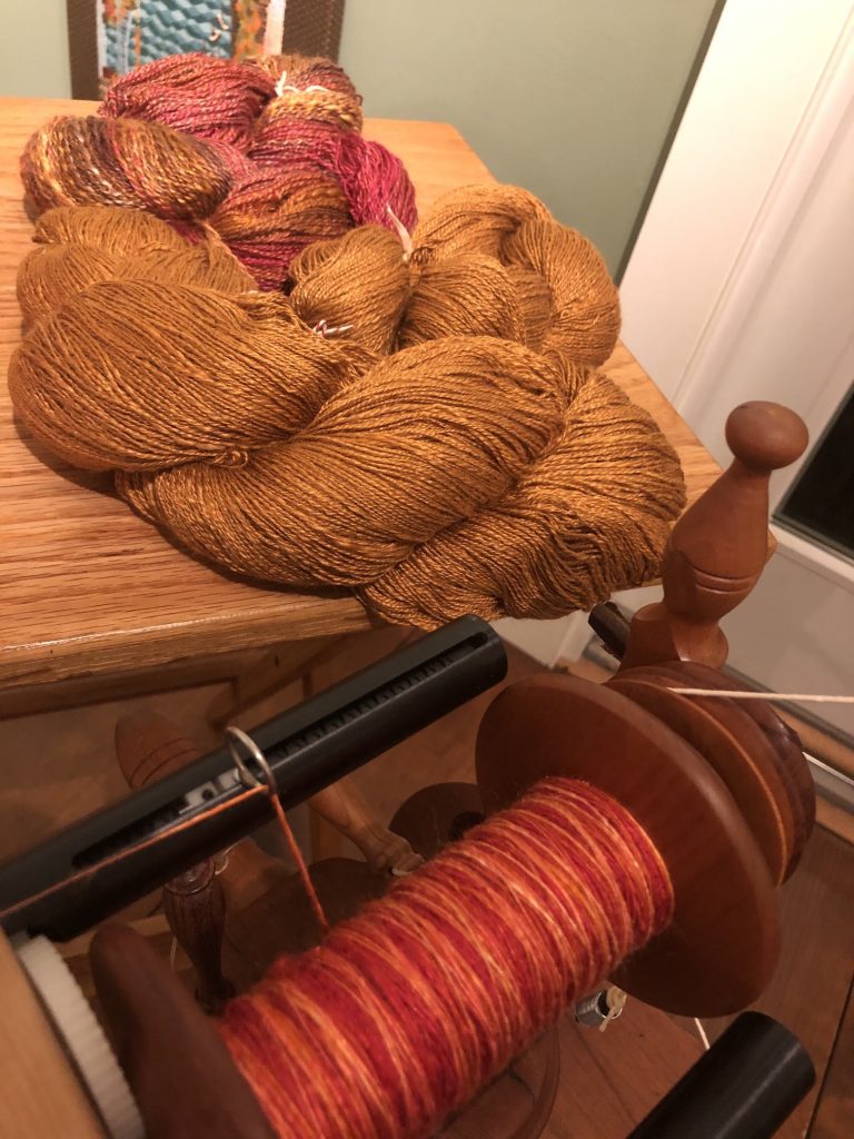 I’ve been spinning my wheels all summer and not managing to verbalize any of it. Ideas and plans are swirling around my head, but not much seems to come of all my deliberating. Some of this dilemma is literal. I have done a lot of spinning. What a calming activity, especially when I listen to audio books while doing it. I expected that a bit of yarn spinning would help the thoughts spinning in my head, but it hasn’t worked that way. I have a large stash of silk tops, and this summer I managed to start turning them into yarn….yarn that might become yardage, someday…..yardage that might become a garment of some kind. All of this is completely nebulous. That feels appropriate since right now nothing in my life feels defined, or planned, or like anything I might count on to happen or become.