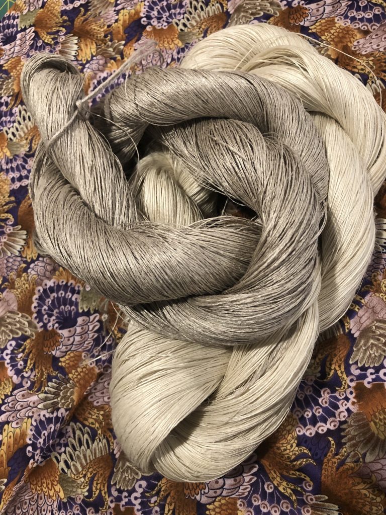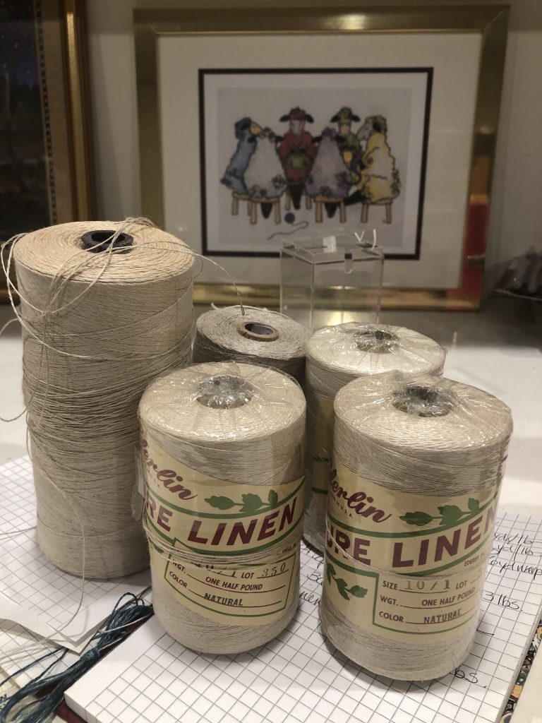 As you can see, the linen is quite old. The front two spools are the same dye lot, but the other two are not. It will make a nice mixed warp when these subtle natural colors are dyed with indigo. Fingers crossed.