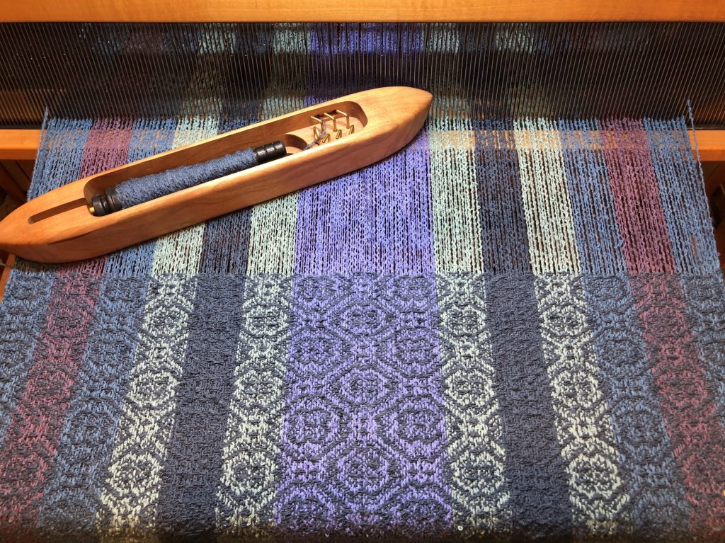 –I use Fiberworks PCW, and I should be able to ask the program to weave in reverse, but I haven’t had luck with that. So I have looked for the place in the pattern where I can weave forward and yet be UNweaving what I did. I am using an Ms & Ws pattern (Strickler 314.5) that reverses, so as long as I’m weaving forward in the part of the pattern that is the reverse of my problem area, this should work. And it does work. I’ve now UNwoven twice without a hitch. It’s when I begin to go forward again, finding the place that goes forward from where I left off, that hasn’t worked.