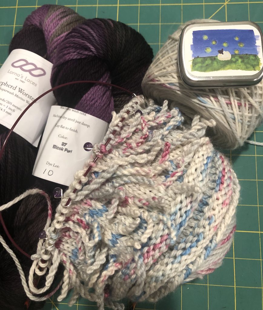 The yarns I’ve ordered so far are from Lorna’s Laces, called “Shepherd Worsted.” The yarn for the adult hat, pictured on the left, is a color called “black pearl.” It will be hard to give that hat to anyone but me! Can you see the little amethyst stitch markers on the needles? They are from Twice Sheared Sheep, my favorite source of stitch markers and row counters. They came in the adorable tin on the right side of the photo. I have a couple colorways of Malabrigo yarn waiting in a shopping cart for a few more hats.