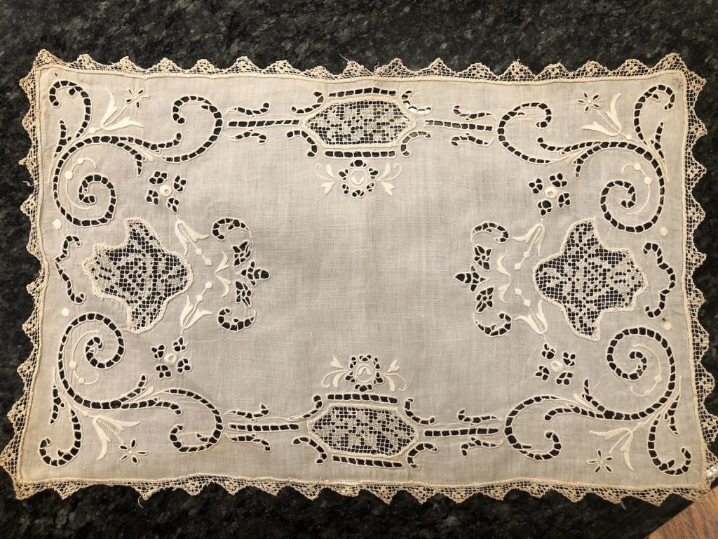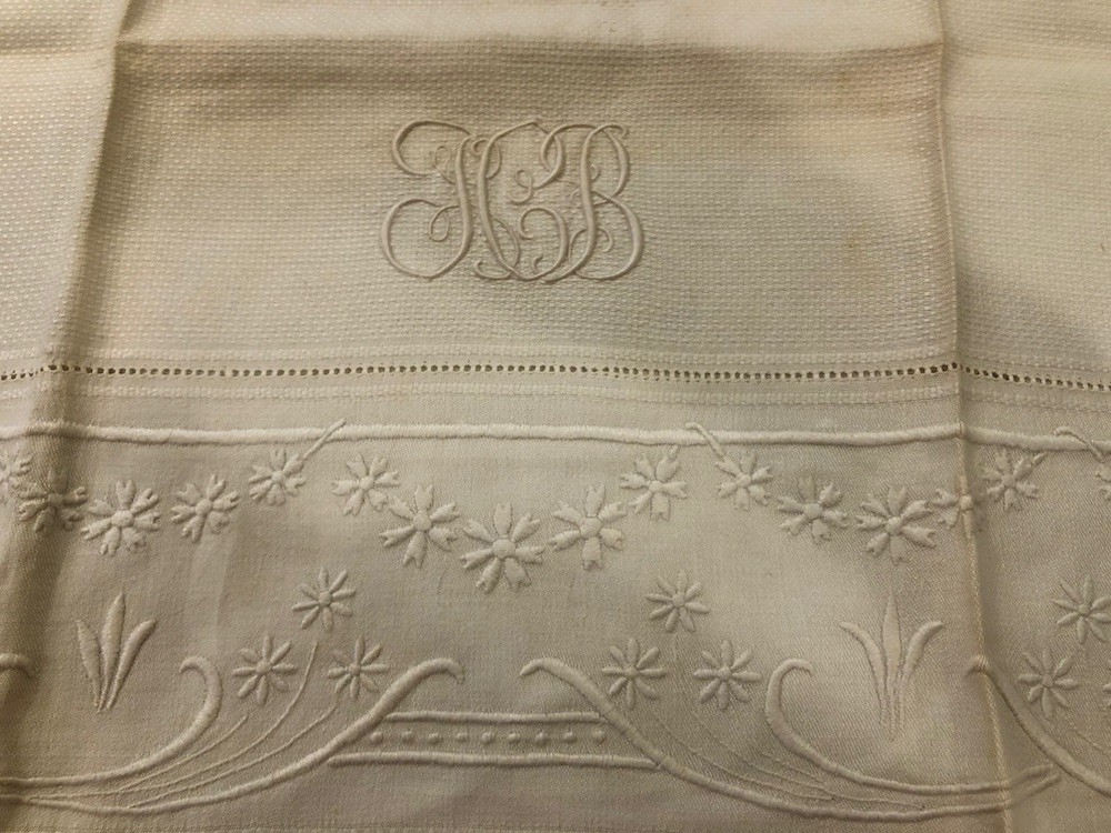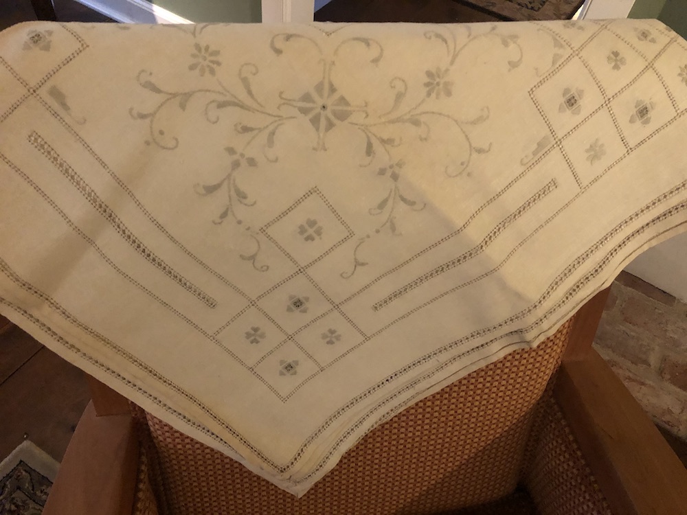 I must share a perk from this week of stress. A friend gave me a big treasure box of antique and vintage linens. Oh my, oh my! I’ve been swooning over the contents for two days now. I’ve dealt with the stains that mostly came from years (and decades) of being stored on wooden shelves that allowed tannins to migrate into the linen. So I have soaked some of the items in Oxyclean and then washed them in the machine. There are tablecloths and napkins, large linen bath towels, handmade bobbin lace edgings on doilies, and even linen bedsheets embroidered in pulled thread designs with satin stitch monograms. Three of the bedsheets are a stunning peachy-pink. I feel weak every time I look at these treasures!