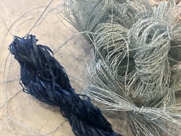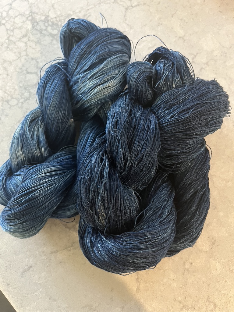 In October I took the remaining paper yarn and dyed it with indigo from a friend’s vat. She had re-invigorated the vat a bit more than she planned. After just a five-minute dip I pulled out my skein that was far darker than I had planned. Well, that’s the nature of natural dyeing and certainly the nature of being a novice. Although it was a quite a bit darker than what I’d envisioned, I was smitten by the variation in blues. It’s quite stunning. I call the color variation ‘abrashi,’ a word I learned from Persian rug weavers.