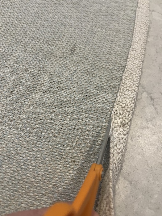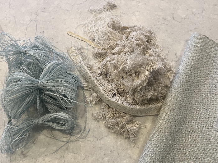 It took me 1 1/2 hours to unpick one placemat. The weft became tangled in the warp whenever the warp got to be longer than 1/2″. So every 1/2″ I cut the warp closer to the weft and continued to unravel. That means the one placemat was cut into almost 50 little fringes. Here is the mess in progress.