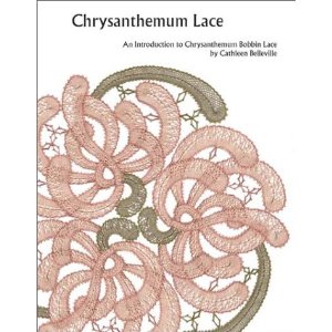 This book cover gives a good idea of the little curved paisley pieces of lace that are made and assembled into the Chrysanthemum. I imagined myself making a simpler flower that could be used to embellish a silk blouse. The lace was to be pale pink on my imaginary bone white silk blouse….