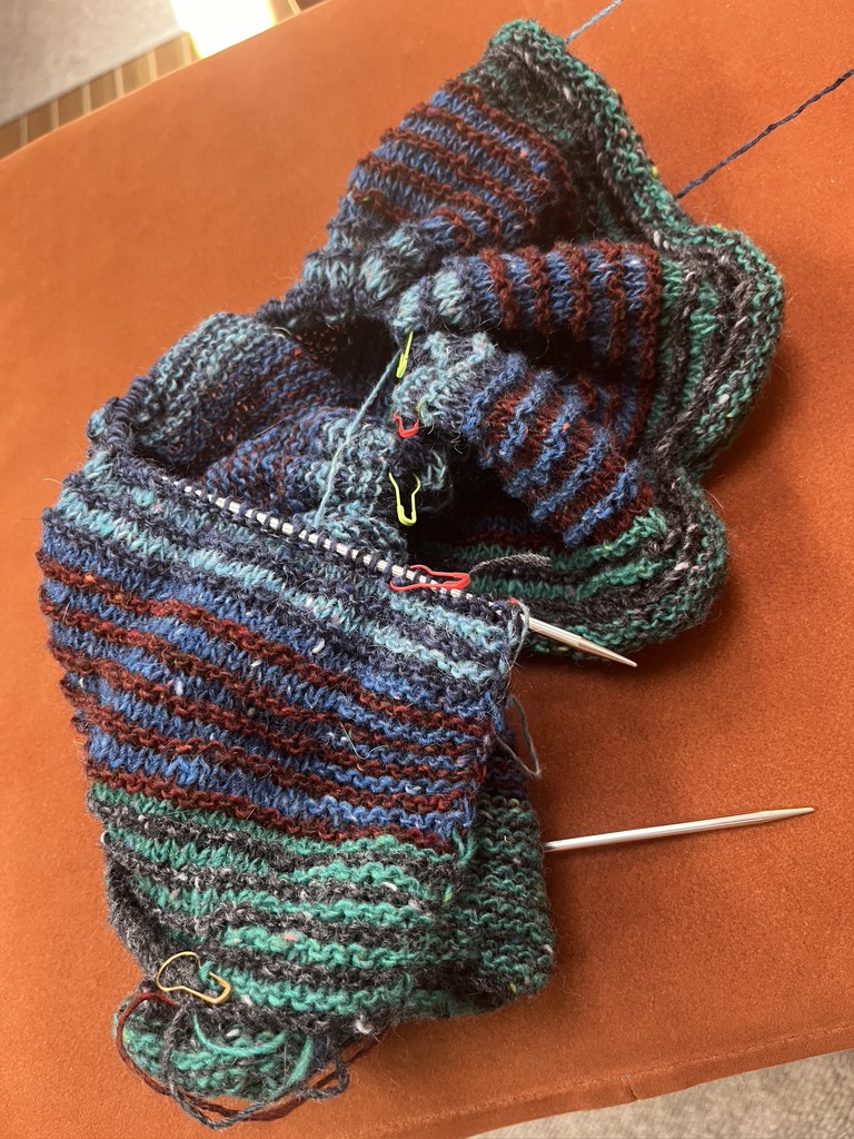 My goal this year is to concentrate on finishing many UFOs, but this gemlike yarn obviously took precedence. I’m knitting a simple top/down raglan sweater and will use the colors from palest at the neckline to darkest at the hem. Even with our busy schedule, I’ve made sure to have relaxing knitting time part of every day.