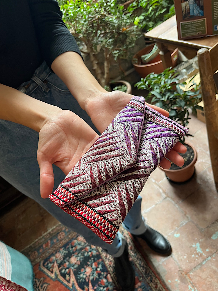 Just before I left home I stopped at Hartford Artisans for a short meeting. It’s impossible to go there without being tempted by any number of wonderful handwoven/handmade things. This time I succumbed to this charming little pouch. It had a rather sad plastic button that imitated bronze. That just would not do! I changed the button to a shell, and added a shell to the plain commercial fabric at the top. I also added a piece of kumihimo from my stash of samples to turn the pouch into a wristlet purse. I’ve got it with me now in the Caribbean, and it is perfect here!