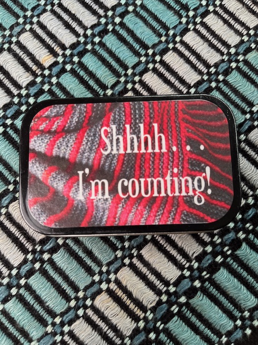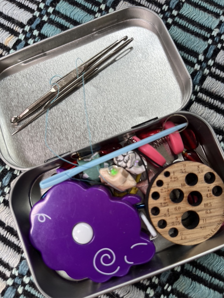 Having extra knitting needles onboard along with tools is worth far more than their tiny weight and size. Ellen, who started the knitting group, has given me a little envelope of dental floss threaders which will get added to this tin.