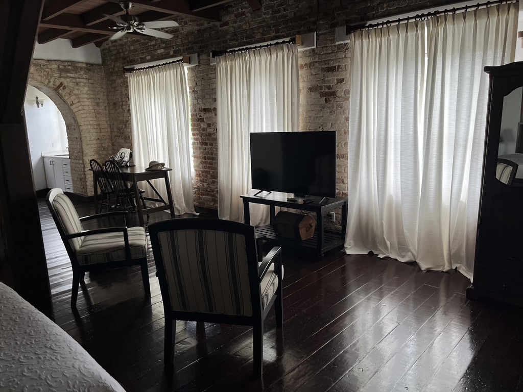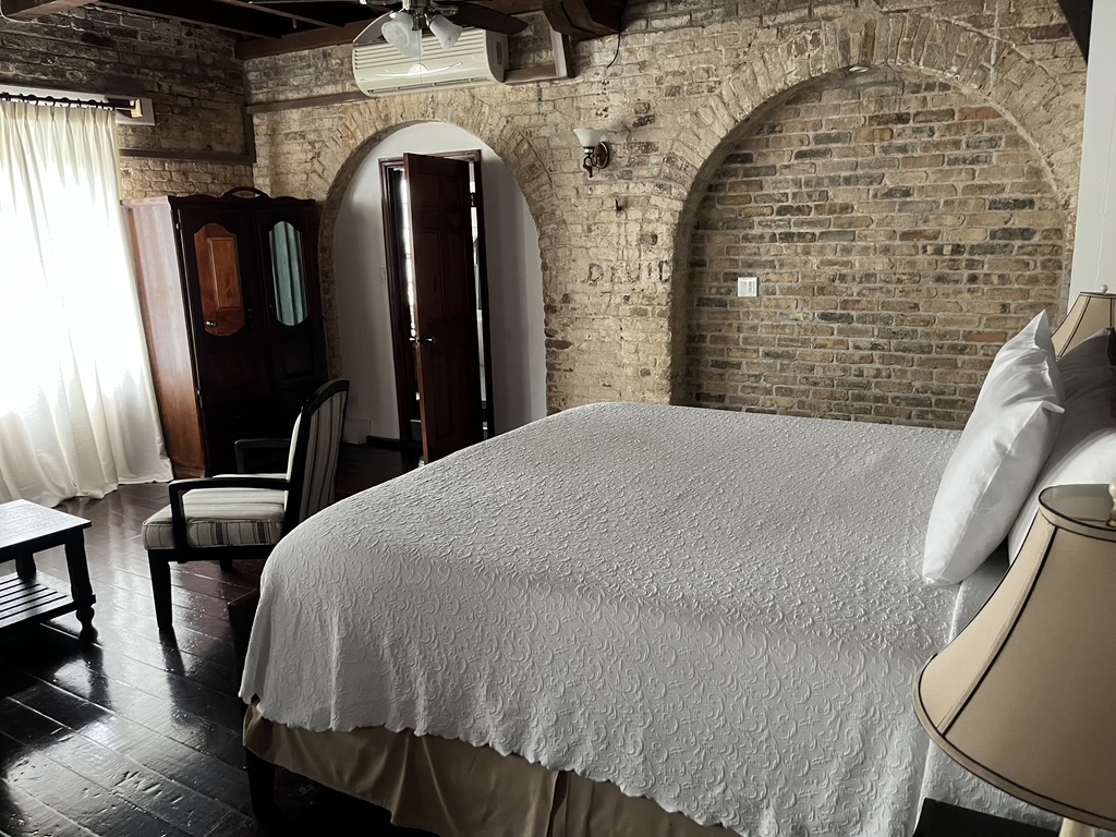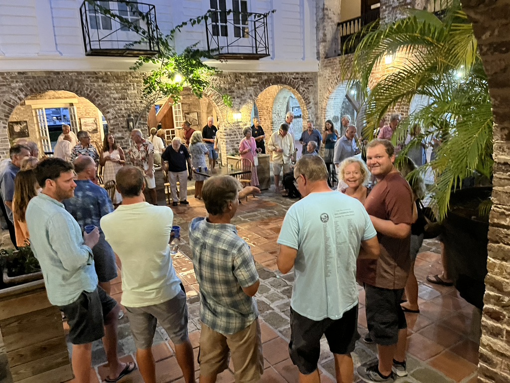 We’ve also had a change in venue for two days last week, which merits showing. Life onboard can get pretty small. I’ve always called it “Living small, with a big view.” Back in November when all of the sailboats that rallied together arrived in English Harbour, the national parks administration here threw a celebratory dinner to commemorate the arrival of so many sailboats. You can see some great photos of this on Bob’s blog. At that event the Minister of Tourism gave Bob the gift of a two-night stay at the historic Copper and Lumber Inn that is part of Nelson’s Dockyard. It’s a place where the Tot Club meets weekly, and this is a photo I took when Bob invited the fleet of our boats to be guests at a tot.