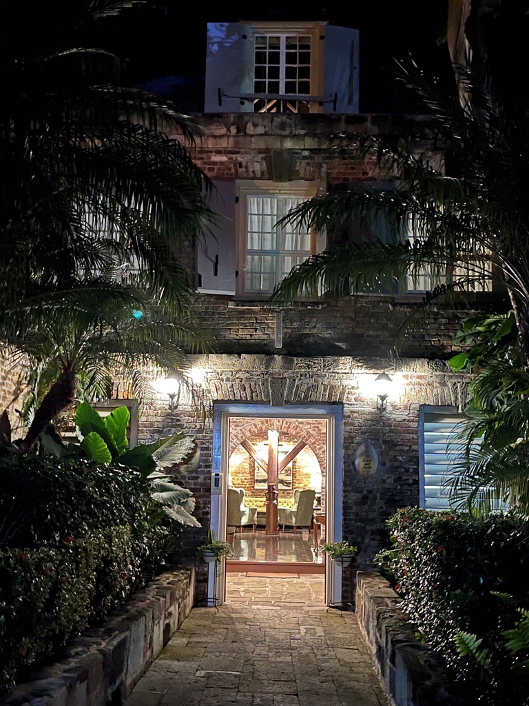 Copper and Lumber is particularly beautiful at night. Above the entrance are the three windows of our room.