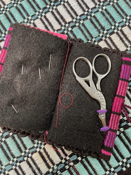 There is a embroidered loop for the button similar to the loops that hold the scissors in the next photo. Lucienne’s finishing work is equal to her fine weaving.
