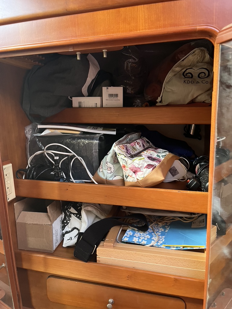 Here’s a look at how I manage my projects onboard. This is where most of my supplies are stored. This 3-shelf cabinet extends back further than I can illustrate in a photo. This year it is holding three knitting projects–the hot water bottle cover and two sweaters– my little Nano 2 e-spinner plus merino/silk fiber to spin, a rather large supply of tapestry yarn for weaving as well as another pile linen yarns for experimenting on a new tapestry design, and various tools. I have two copper pipe frame looms onboard, and they are stored in the hanging locker that holds Bob’s clothes. They couldn’t possible fit in my hanging locker, and luckily Bob is a very good sport about my need for equipment and stash!