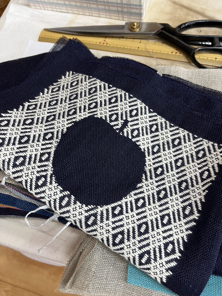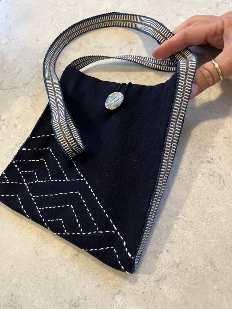 Fast forward 25+ years and I have returned to this technique. Now there are books galore on the subject and even online shops that carry kits. What a world! Last fall I took an afternoon online class through Tatter on making this small cross body bag. The teachers were two Japanese sisters from California, Marico and Toshie Chigyo. My stitches are far worse than what I did a quarter century ago. I wish I’d had the option of a cream thread rather than this blinding white. I wish I understood how to transfer the pattern to the fabric. I used a bone tool to impress the fabric, but the impression was not sharp enough for my aging eyes. One of my weaving mentors (Sr. Bianca from the Weaving Center in Tarrytown, NY) gave me this sage advice. She noted that when I did the large bag for my marudai I was a beginner who worked slowly and carefully. I should have had that attitude in returning to this technique. I am still a beginner and should have worked slowly and carefully yet again. She says it looks like I worked this piece as if I knew more than I really do! It’s so true. I also think the pattern is out of proportion to the size of the bag. I should have reduced the size of the sashiko pattern. Next time. And I will take it slowly (speaking of time!). And... I realize I can make my own flat woven braids on my taka dai for future little bags. What a thrill!