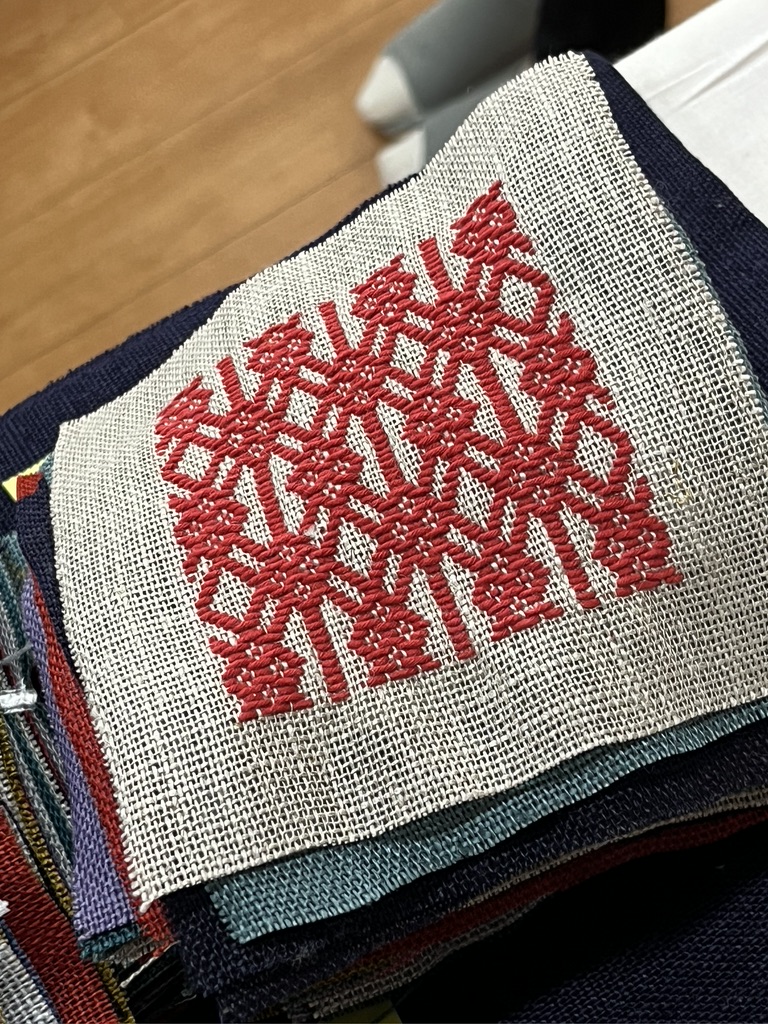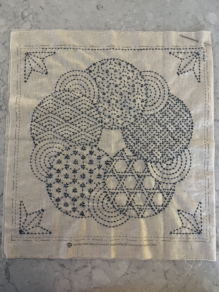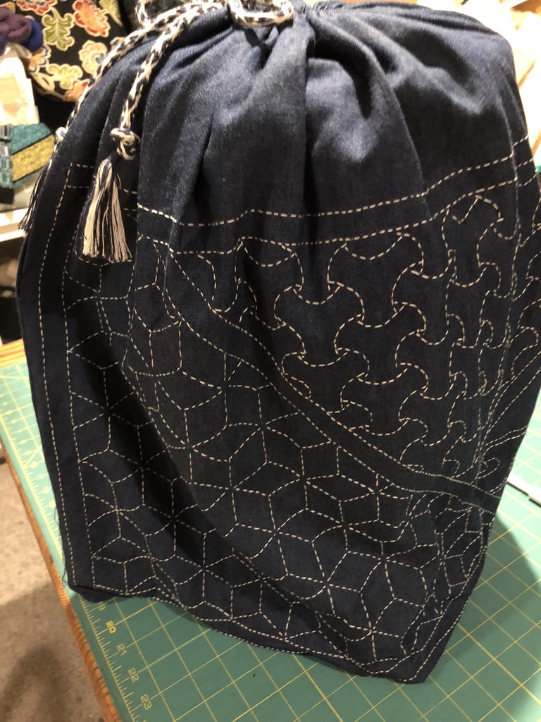 To keep busy while I forage for that indigo kit I’ve been doing some sashiko embroidery. This is a project I made more than 25 years ago, when I knew nothing about sashiko and there were no Japanese fabrics or traditional sashiko threads available. I just used some denim fabric, probably from JoAnn’s, and I have no idea where I got the thread. It is thinner than the sashiko threads I can find now, but at least this thread had a wonderful matte finish so it looks quite traditional. Somehow I found these traidtional patterns and transferred them to the fabric before I began embroidering. I have no idea how I did this or how I found about sashiko back then. I made this bag to hold my marudai, and I made a kumihimo draw string for the bag.