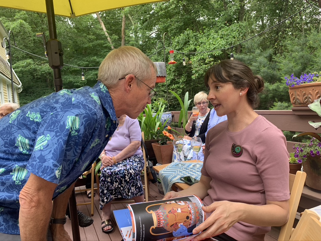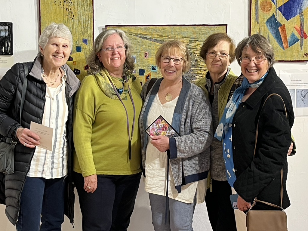 I was particularly thrilled to have some of my friends from the Connecticut guild stop by. It’s a commitment to drive to Leverett and these friends made a day of it. Lucky me that they chose the day when I’d be there. I hadn’t seen these friend since I left last fall to spend the winter living aboard Pandora. Behind us are three stunning tapestries by Minna Rothman. The photo was taken by my dearest, oldest friend who also came to visit the gallery that day. On top of the five friends, there were seven or eight other visitors. Someone did a great job promoting this exhibit!