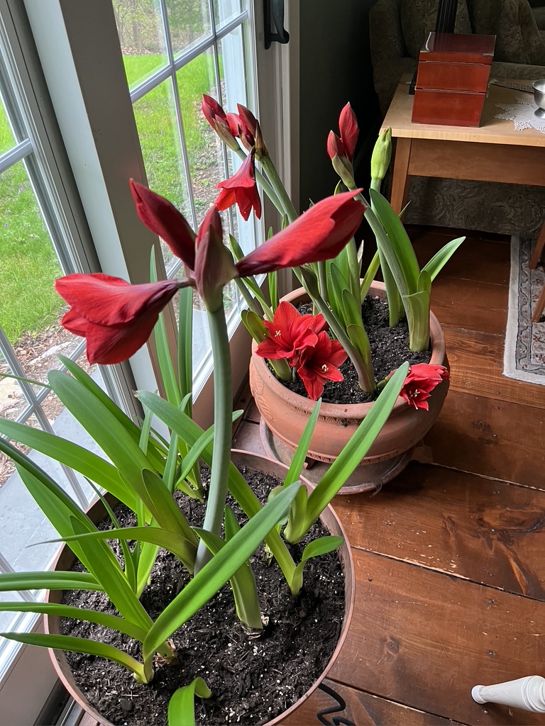 Last fall Bob repotted our collection of amaryllis into three different pots. It looks like he got all the reds together, in spite of not knowing which bulbs were red vs. all the other colors we have.