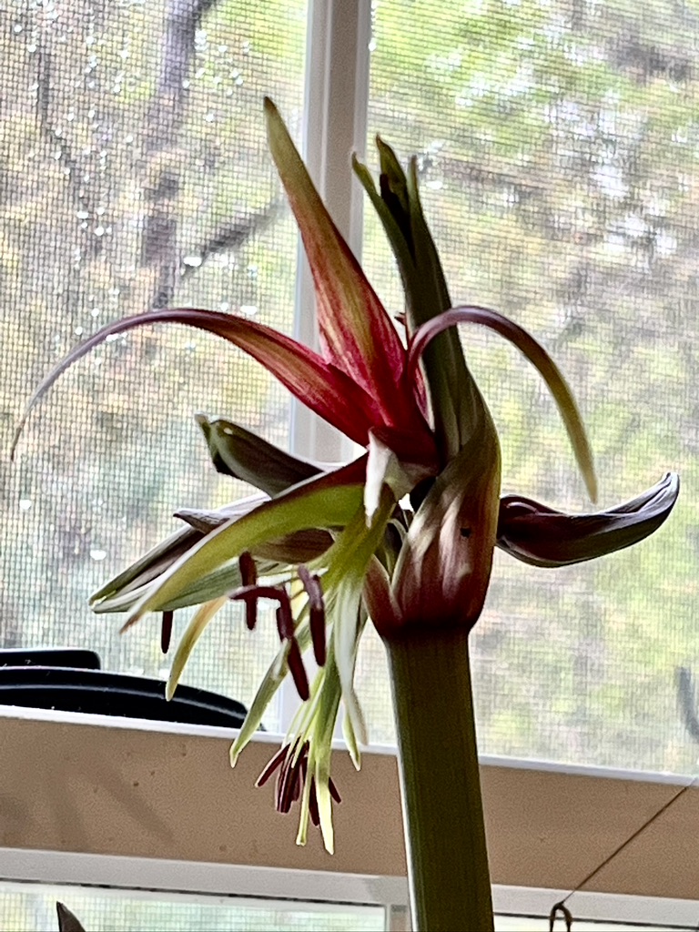This morning my newest amaryllis bulbs are about to bloom. These are two bulbs labeled “Chico” and “Wild Amazon,” the only bulbs we have with labels. I don’t know which one this is. I love the varieties that are less hybridized and showy. These look quite exotic with flowers that are a mix of green and burgundy. Tomorrow it should be fully open.