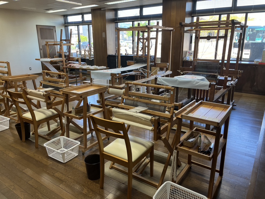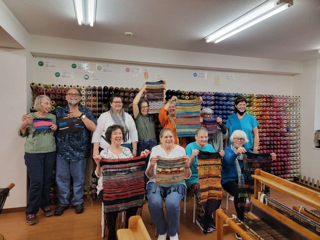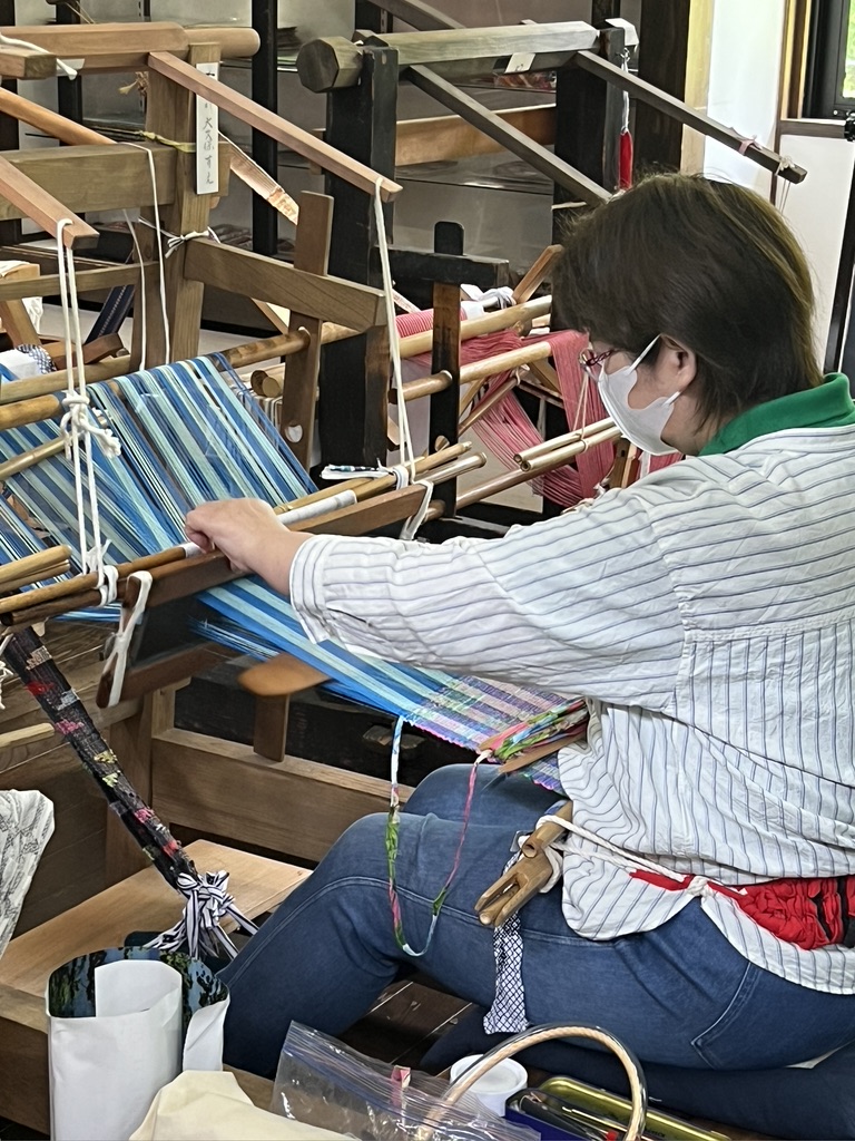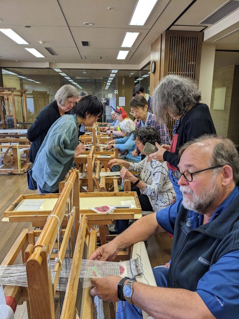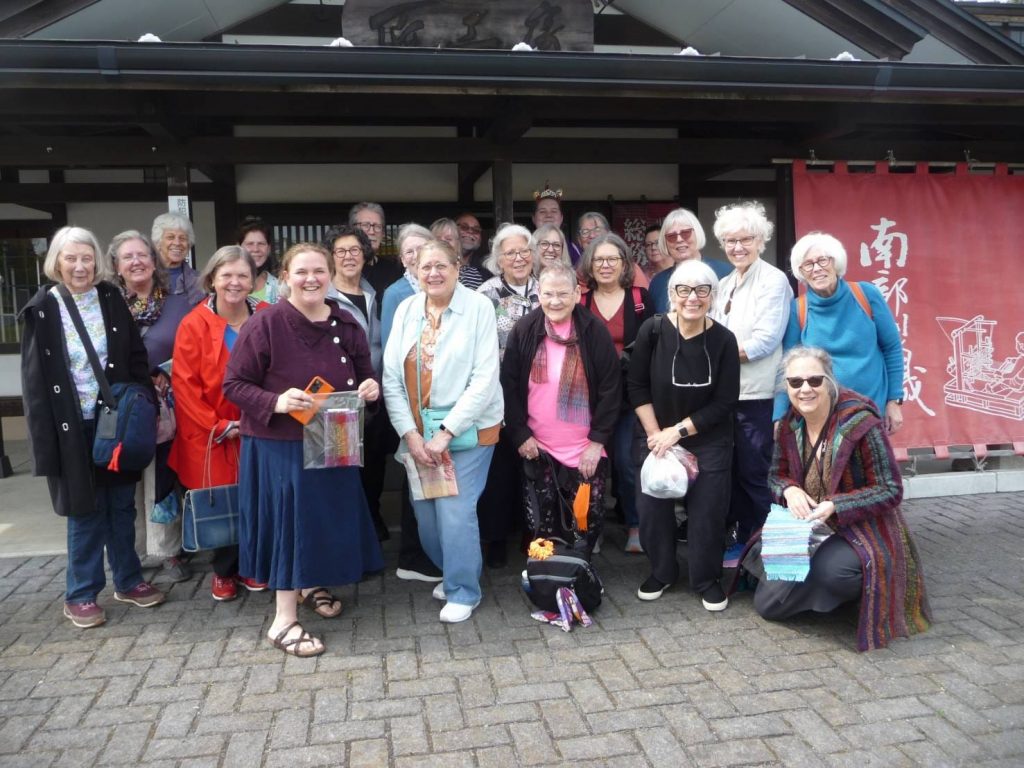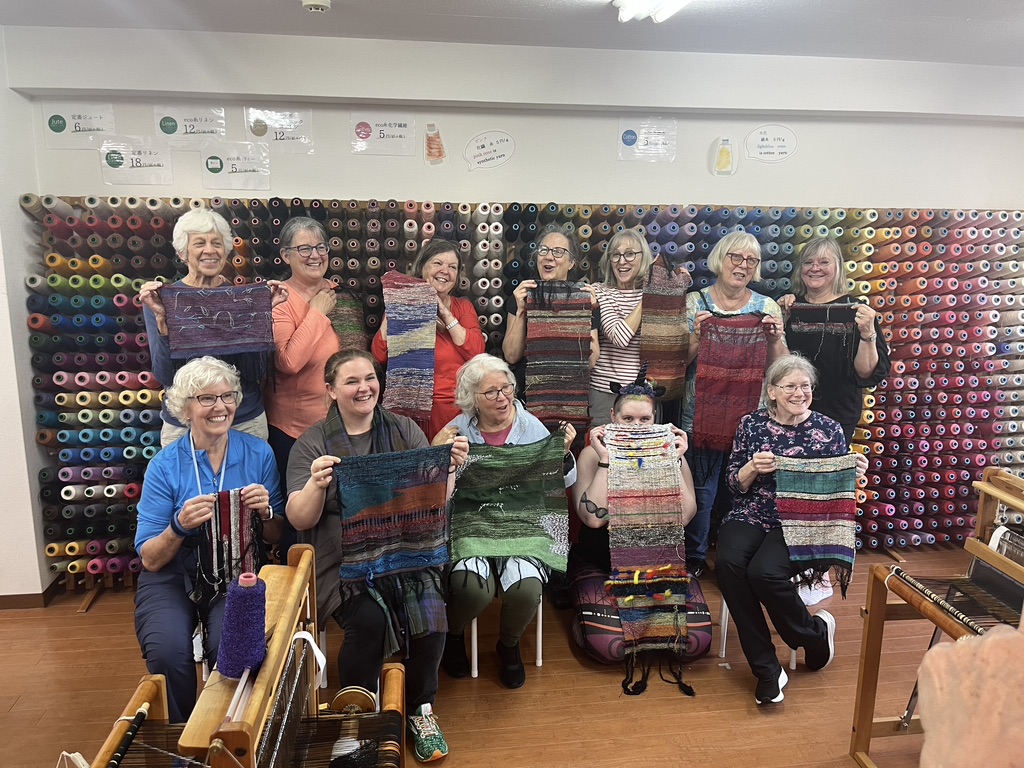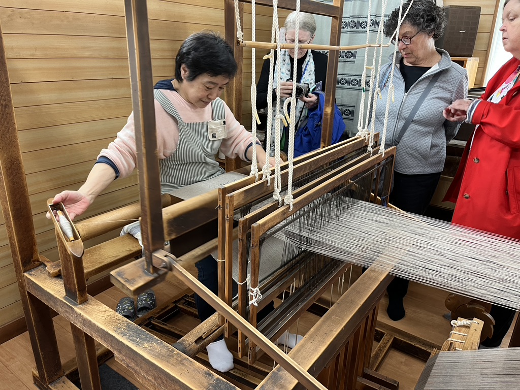 One cultural tradition from this trip that I hold dear is the act of bowing, and the way all the workers we visited came outside to bow and wave goodbye to us as we left their presence. It even happened at large hotels. The staff would come stand beside our bus and bow and wave to us as we headed off into our future. Eventually these thoughtful goodbyes brought tears to my eyes. Wouldn’t life be sweeter if we all bowed to each other in salute? This particular incident happened at the Sakiori workshop. I remember these weavers with affection, along with everyone who crossed my path on this journey.