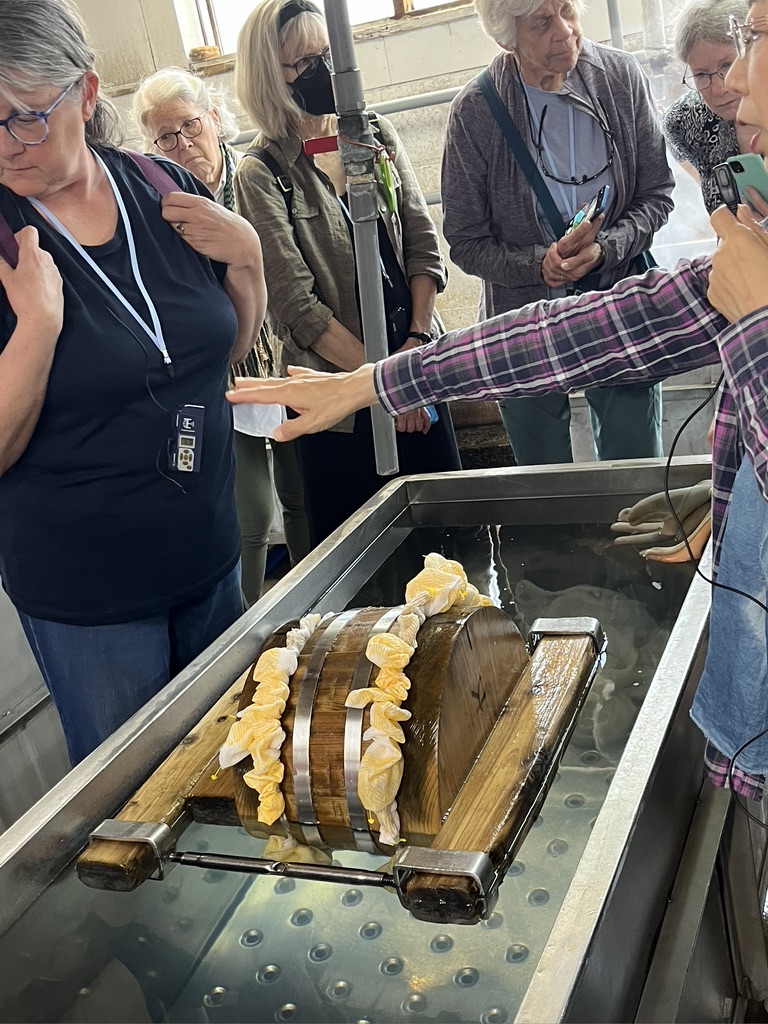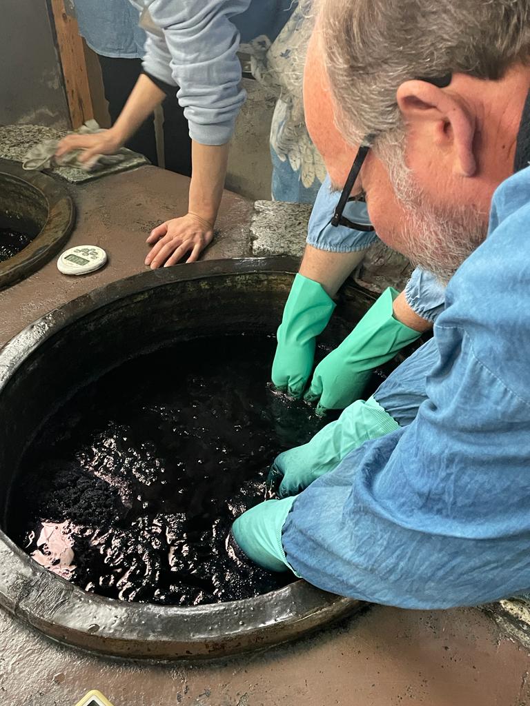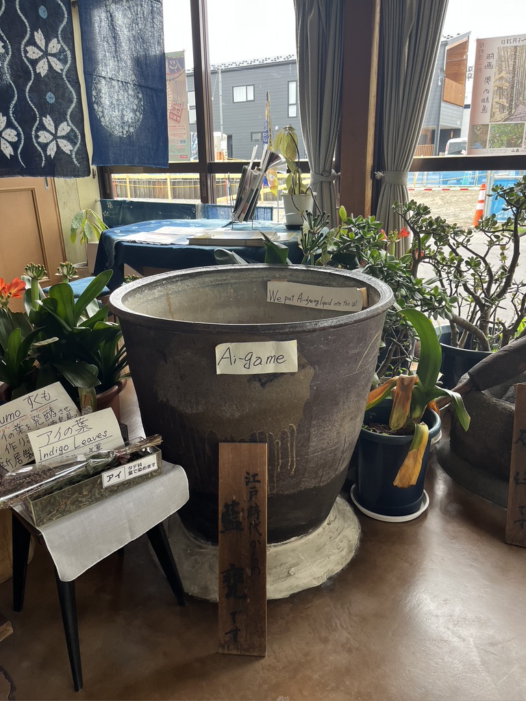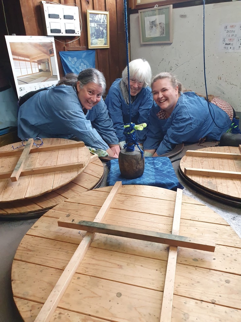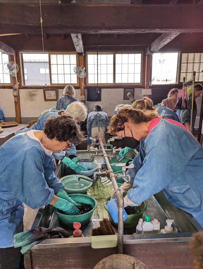 This is where the fun takes place. We were each given an apron to wear and waterproof gloves. The workers were wearing such creative aprons. This makes me think about what I’d like to do with my indigo vat at home. Indigo dyed aprons might end up as part of future gift giving.