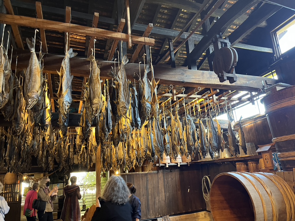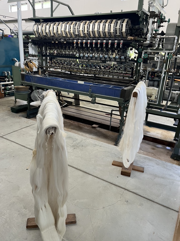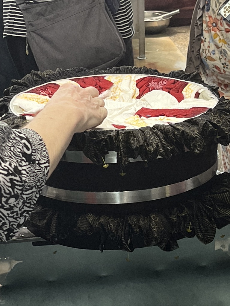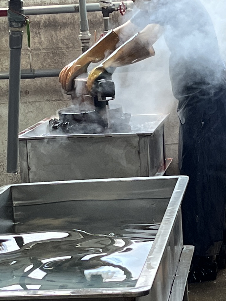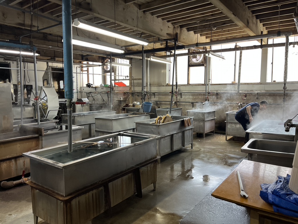This is where the fun takes place. We were each given an apron to wear and waterproof gloves. The workers were wearing such creative aprons. This makes me think about what I’d like to do with my indigo vat at home. Indigo dyed aprons might end up as part of future gift giving.