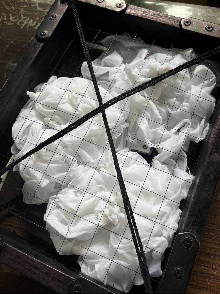 Wet cotton scarves twisted and scrunched, then placed in a wire cage, ready for the indigo vat.