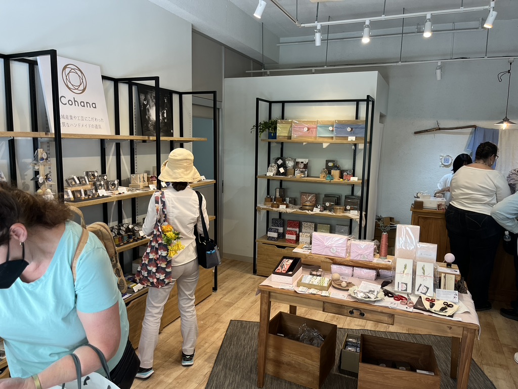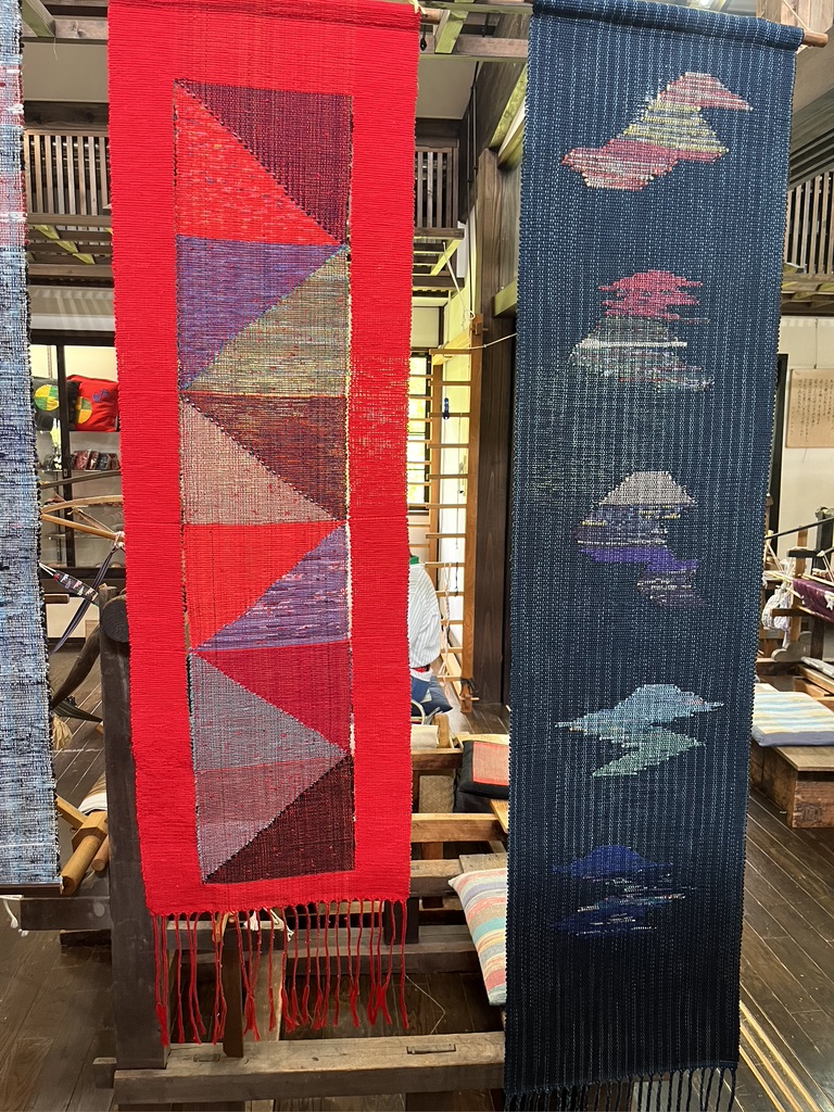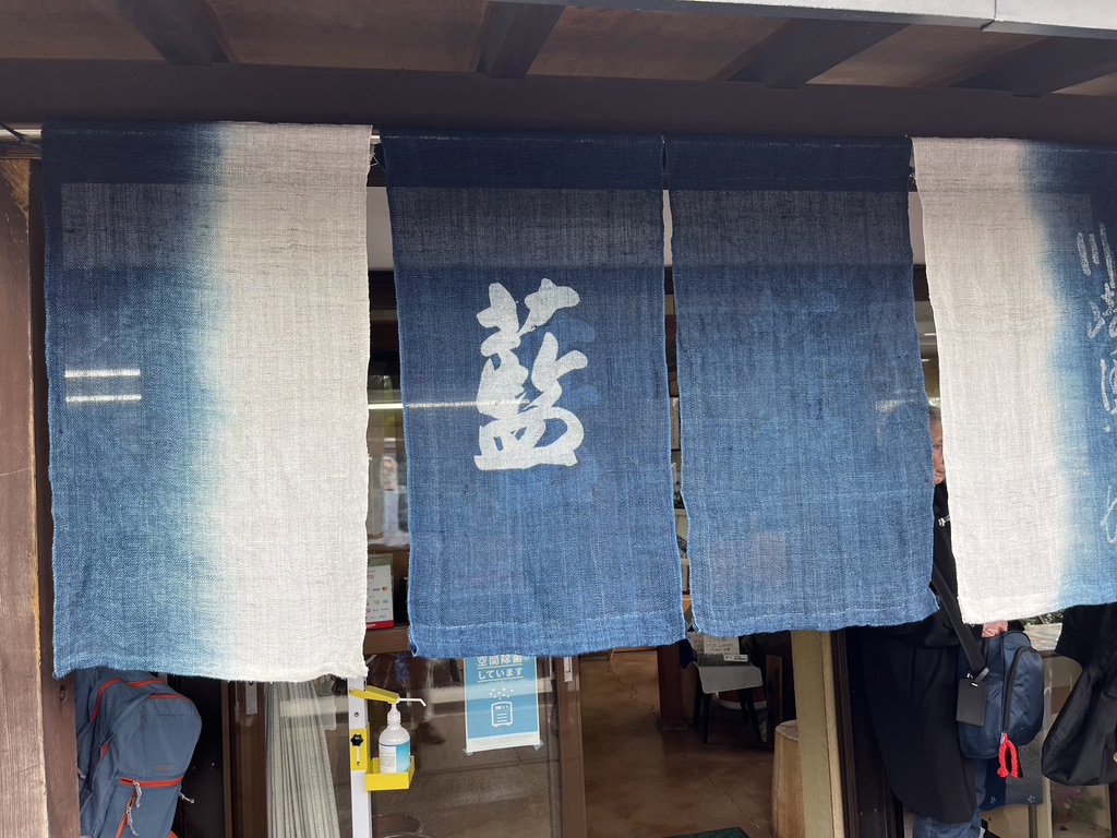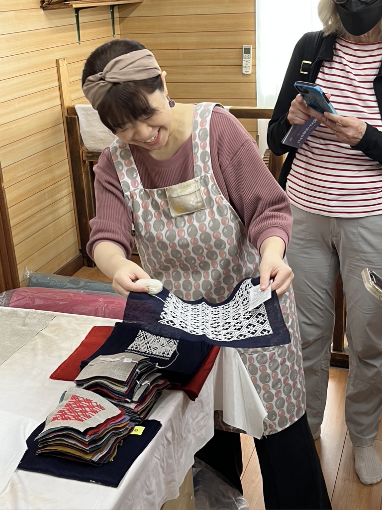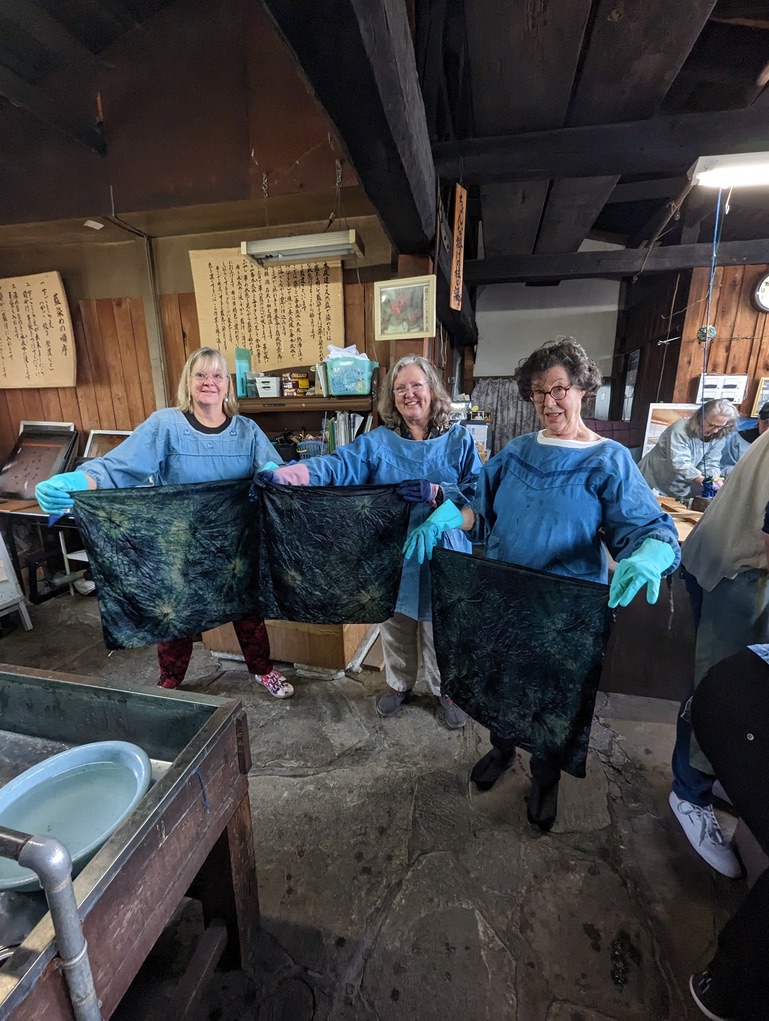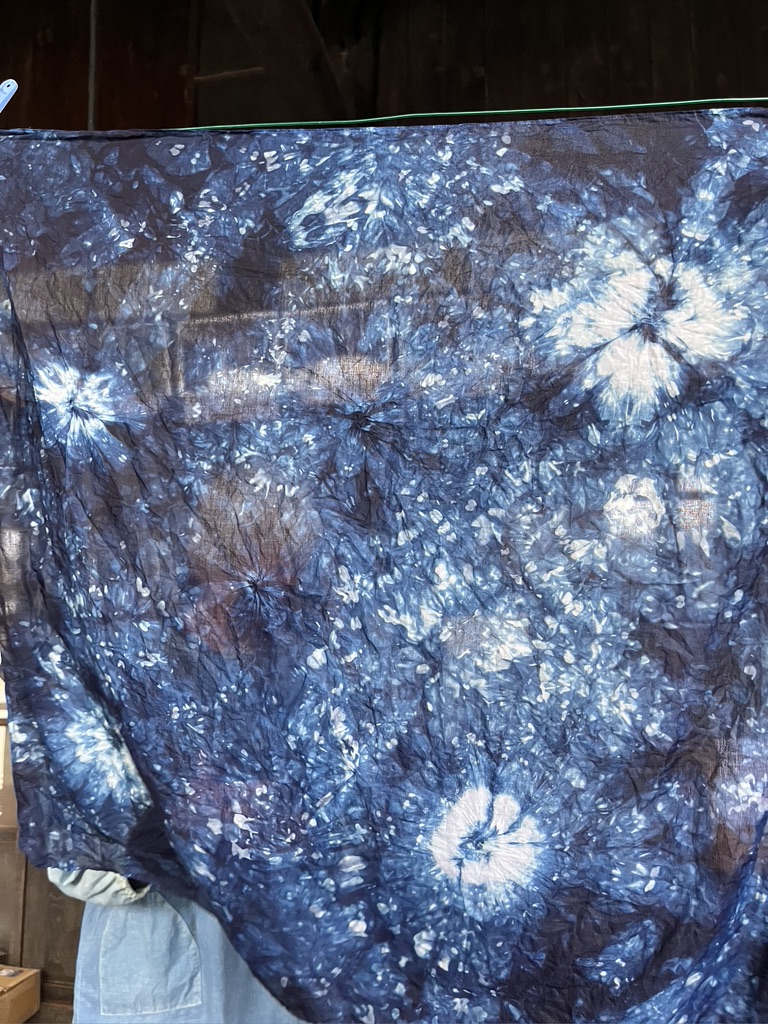 The lightweight cotton fabric dried quickly on a line in the studio. We shopped while our scarves dried. I bought a scarf and an indigo dyed skein of traditional cotton used in sashiko embroidery.