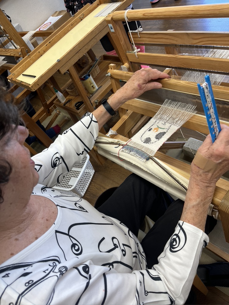 The director of this organization recently got a letter from a blind weaver in the Southwest, asking if there were any audio sources for learning to weave tapestry. I have done a preliminary search and found nothing. Yet there is one weaver out there who wants to do this. There is, or was, a weaver at the Artisan Center who wove a tapestry that hangs on display in the hallway. I don’t know whether that weaver is still with the Center, but if so, I’d like to her/him. The piece is more texturally interesting and is not based on imagery. It has striking merits. As we all know, there is no one way to describe or view tapestry, and no one correct way to achieve an idea. While I was thinking through ideas, Bob googled textured tape to see if there is a tape that has bumps or some kind of measurement device done in texture rather than in visual marks. By Jove! There is! I thought about how to describe the process of making an Archie Brennan copper pipe loom without any visuals, how to describe the seine twine I’d recommend for the first few warps, and at some point, how to describe various techniques. I thought about describing the warping process in words only. Are you now thinking too? If so, I hope you’ll get in touch. Creativity should be accessible to all people, and it falls to some of us to make this happen. In the meantime, I’m going to proceed, hopefully talking to some of the visually impaired artisans about what kind of instructions make the most sense to them. I am hopeful.