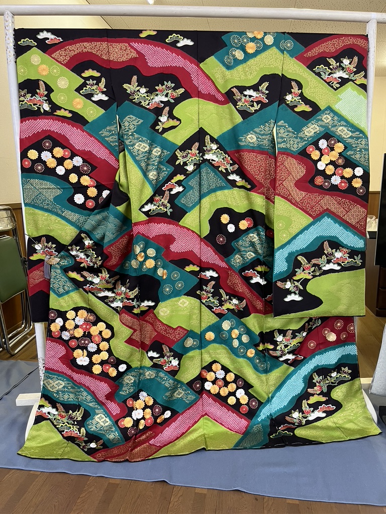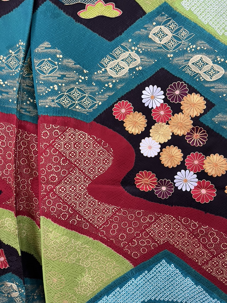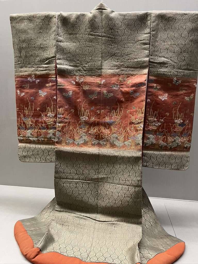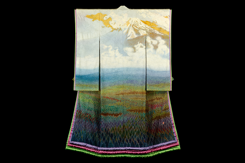 Here is an image I took from the website. Surely they won’t mind since they don’t allow photography. Isn’t it striking how the summit of Mt. Fuji is in the band at the back of the neck? The kimono in this series are displayed right next to each other, with each kimono sleeve touching the sleeve of the next in the series.