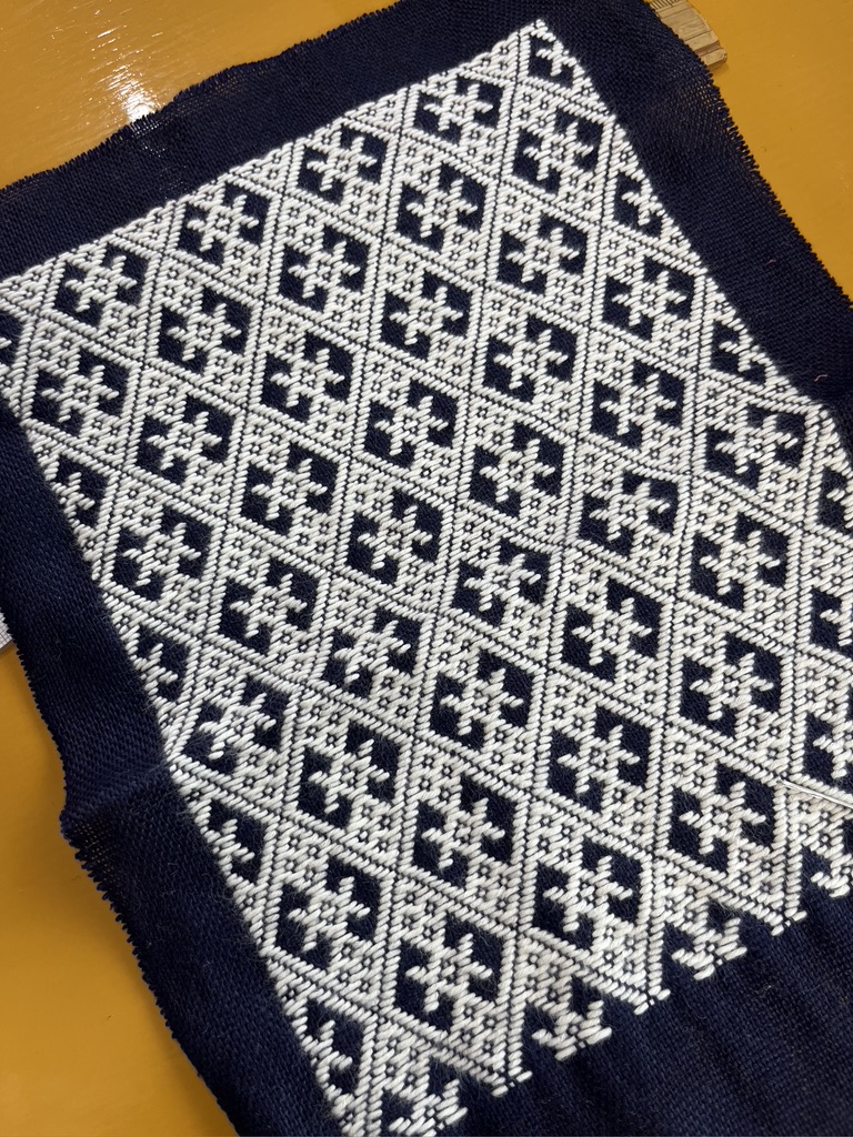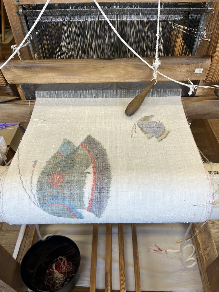 Our guide told us that most of the textiles seen in the museum are reproductions, not the actual historical pieces. This is due to the fragility of textiles. Many of the reproductions are woven by the weavers at the village. This woman is weaving a patterned linen cloth that can become serviettes (napkins) as well as being pieced together to make a tablecloth. It’s a brilliant idea to warp a loom for the napkins and then piece the tablecloth in three sections. With a warp 24″ wide you can hem for 20″ dinner napkins and then piece three longer lengths together to get a tablecloth in the 60-64″ width.