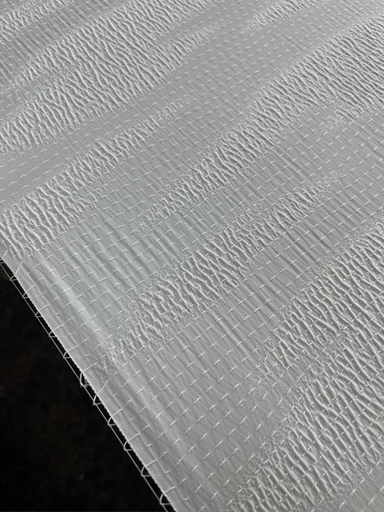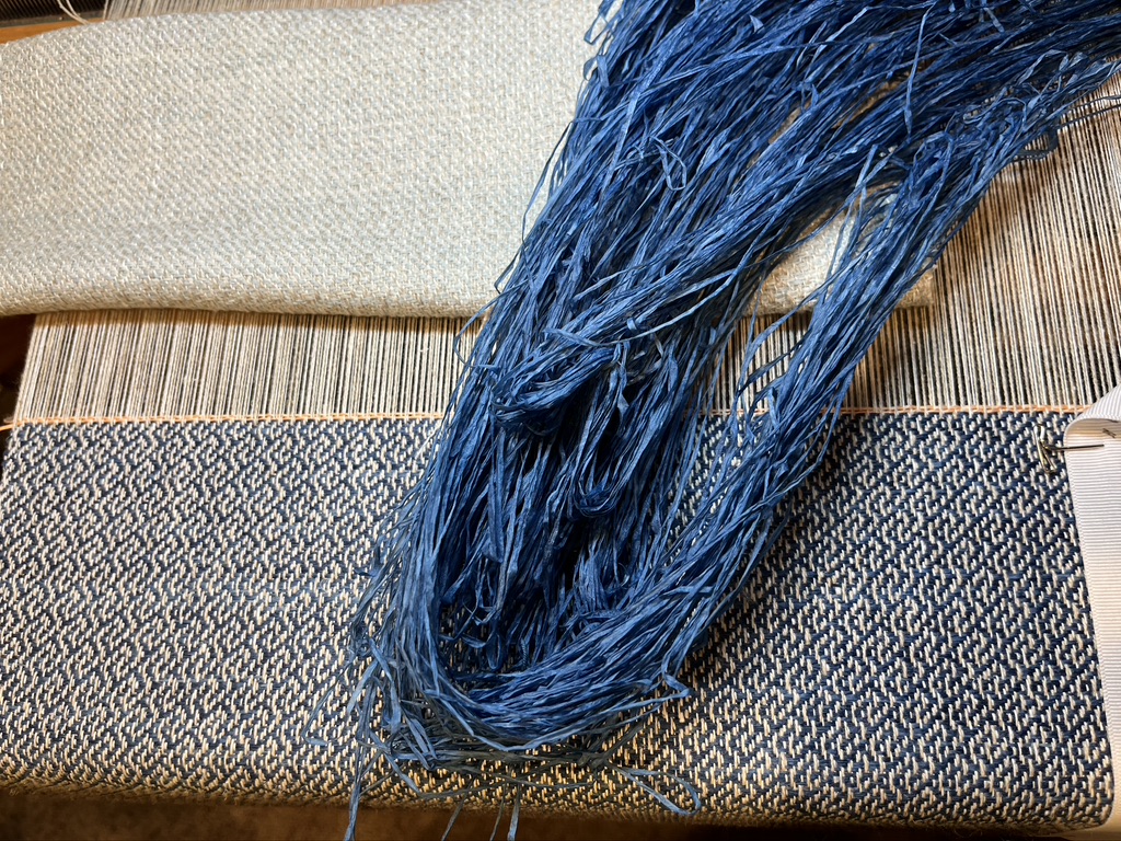 It was such a pale, boring blue against the white/natural warp. I was very happy with the newly dyed indigo paper yarn. When I wet the yarn before dyeing it fluffed up again. I’d say it UNcompressed itself, or so I thought.