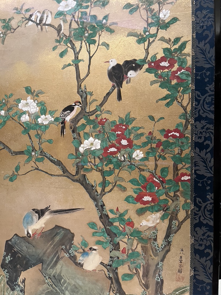 And then there were galleries of scrolls and kimono. I find it fascinating that fabric features so prominently in wall hangings that have painted scenes. This is a culture after my own heart. Look at the edge fabrics that frame this scroll.