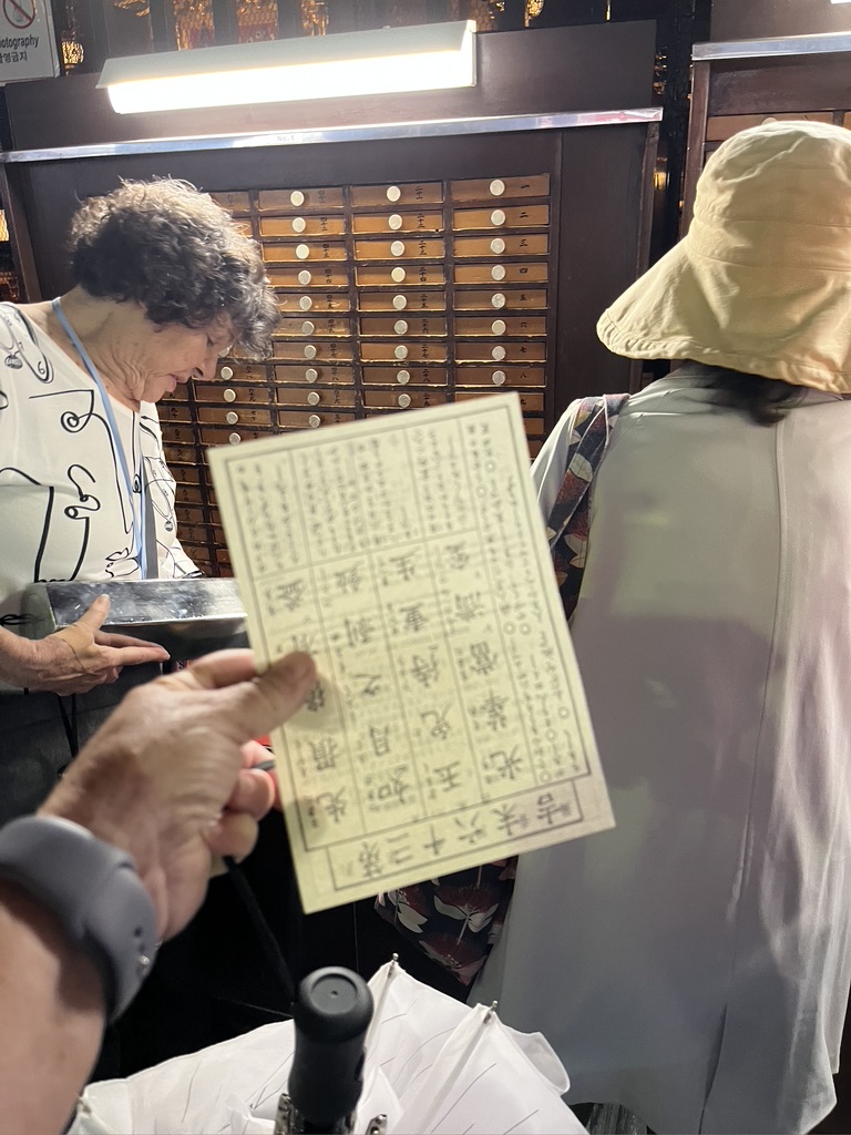 There was an area where you could get your ‘fortune’ for a fee. After you put coins in one end of a large tube, you shook the tube and pulled out a stick from the other end. It had a number on it, and you then pulled a paper out of the drawer with that number. This the paper with my fortune.