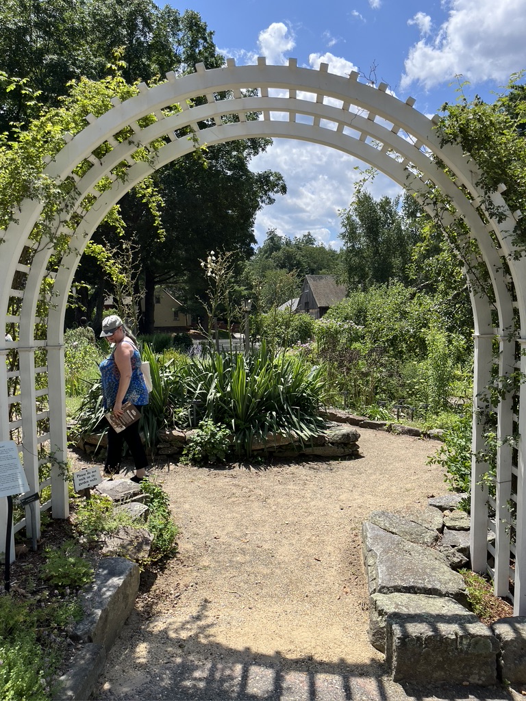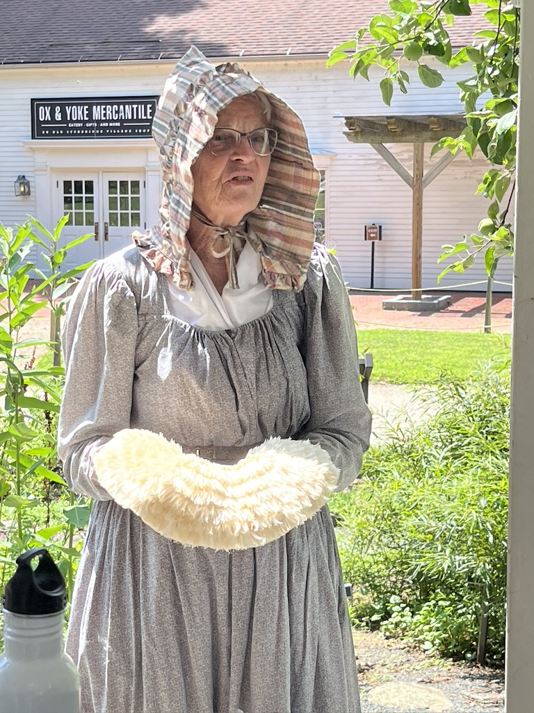 Our guide has been working in the gardens of Sturbridge Village for over 40 years. She has been instrumental in changes to the gardens during this period, and since she is also a spinner and dyer she is knowledgeable about gardening as well as how these plants were used. Her name happens to be Higginbotham, perhaps not spelled quite that way. I wish I had asked her if she was related to the man who made that flax spinning wheel.