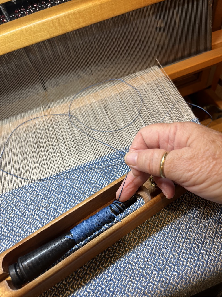 Now I’m faced with UNweaving this placemat and starting again with a different weft for the hems. It’s laborious. I think I am about 4 hours into it, and I have only UNwoven half the placemat. I’m treadling backwards, throwing a shuttle, and winding the yarn onto the pirn after every four picks. It’s the most efficient way I could think of, but if you know a better way, please give me a shout–soon! I hope to finish today. So that’s how I’m spending my day before Independence Day. Hmm…