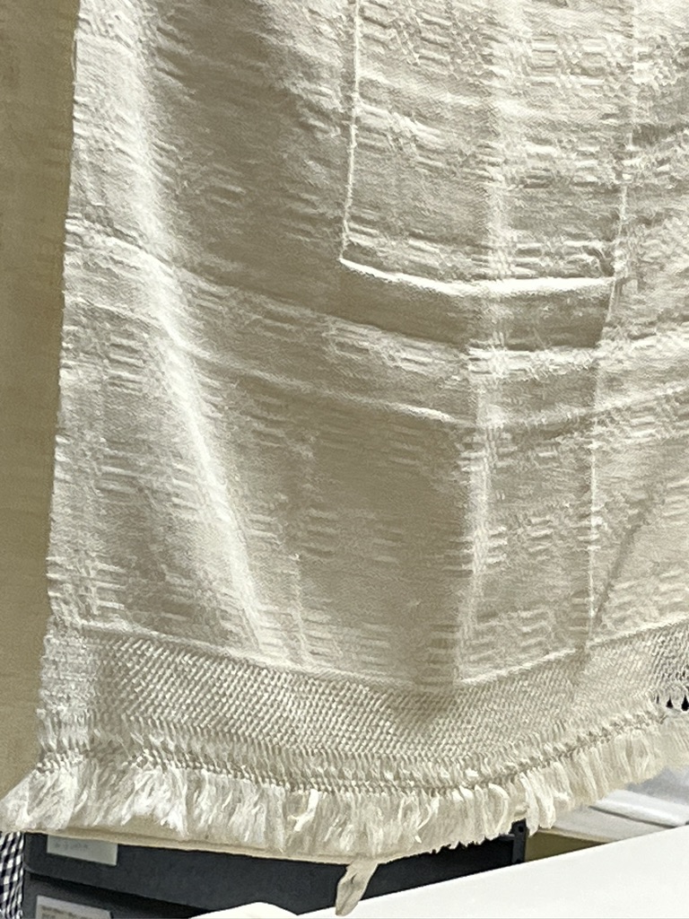This towel has an attached fringe. Elaborately knotted fringes were quite popular in the mid-19th c, and they were added on rather than done with warp threads. Since they had been added, if the fringe began to deteriorate, it could be removed, leaving the hemmed towel in good condition.