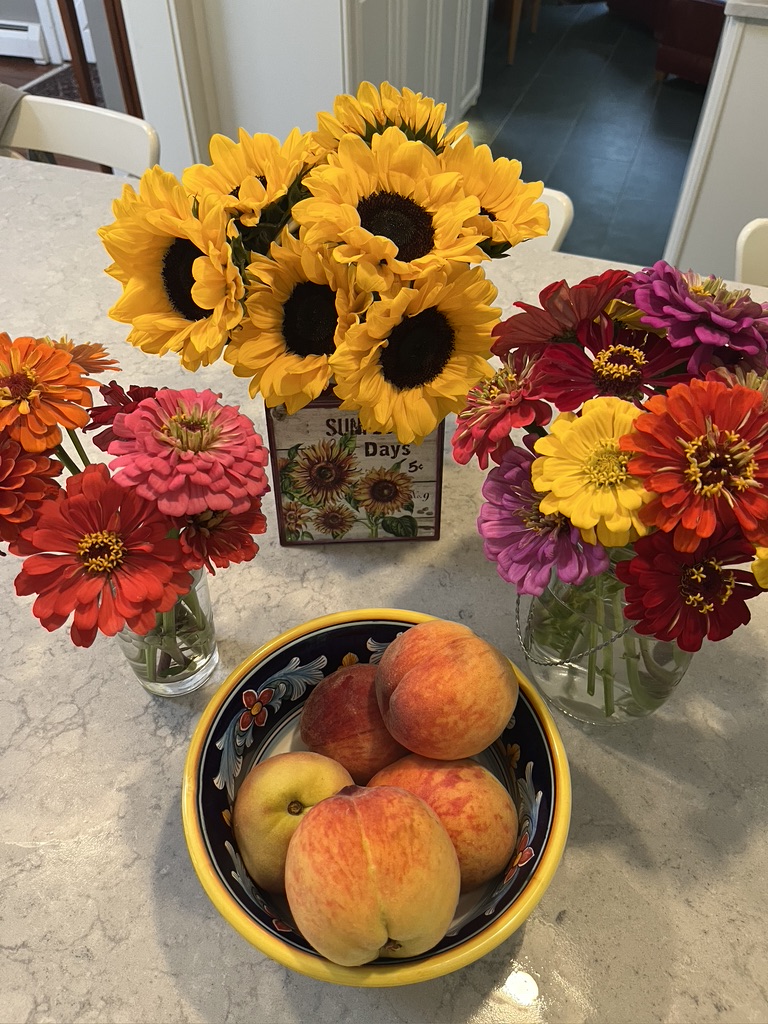 In the space of five days I visited airports three times. I’ve never gone to an airport so many times in such short period without taking flight myself! I dropped Bob at Bradley on Wednesday so he could fly to Florida to visit his brother. Later that day I picked up Connie Lippert at Logan. Then on Sunday, I picked up Bob from Bradley as I drove home. What a whirlwind! It was all great. And, returning home I am enjoying the bounty of July in New England. The sunflowers are from a friend and the zinnias and peaches came from our local farm stand that Bob visited this morning.