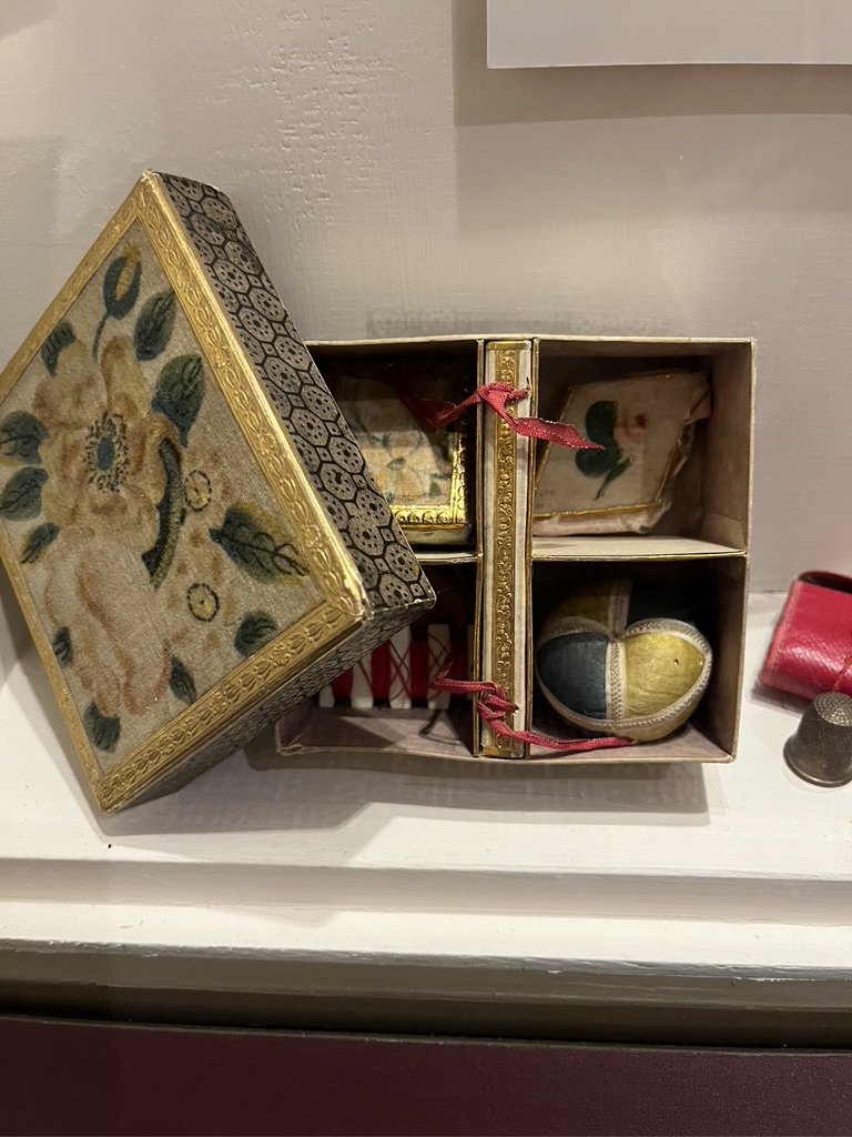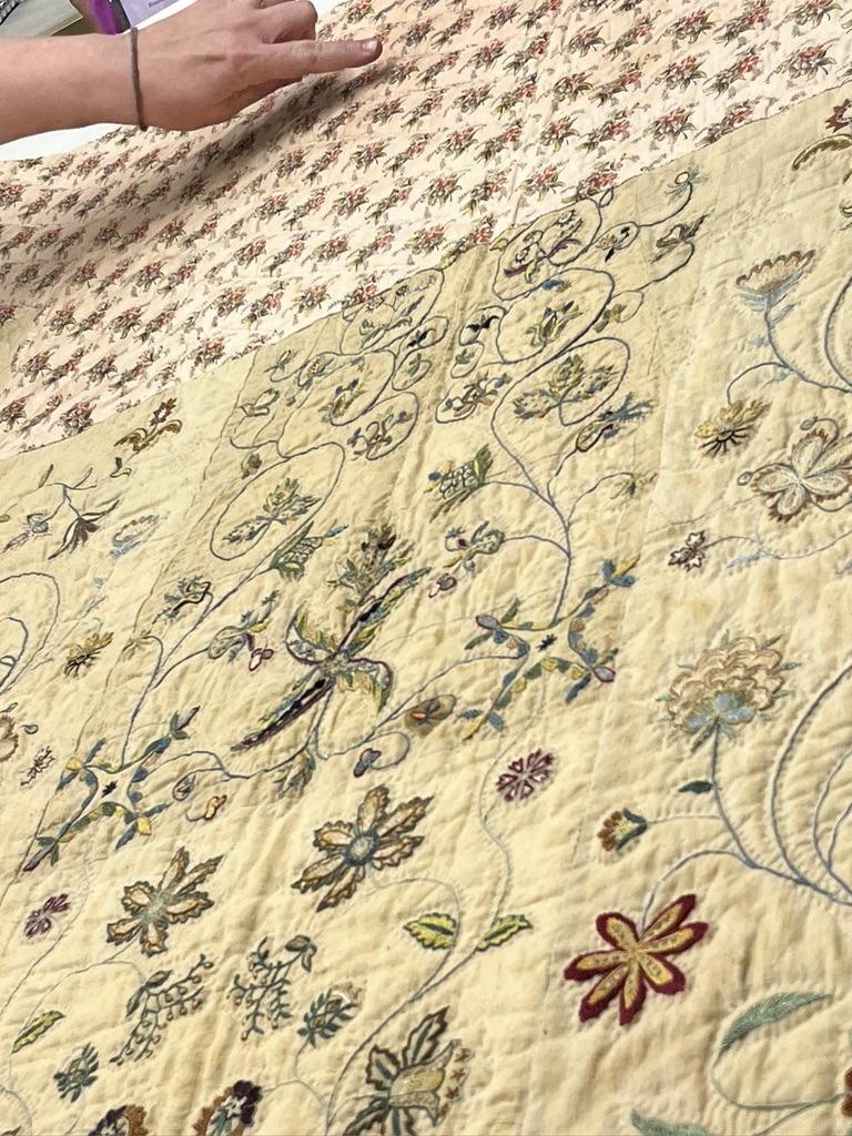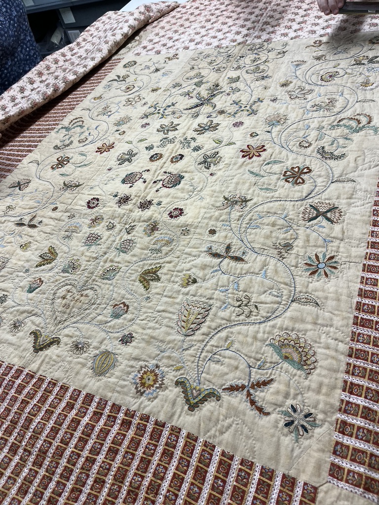 We also saw a marvelous quilt made to accentuate a beautifully embroidered purse. Purses from this time period were usually drawstring bags that were worn inside a skirt with a slit that allowed access to the purse. Our guide explained that this particular purse may have been a treasured memento to the woman who designed an entire quilt around the purse.