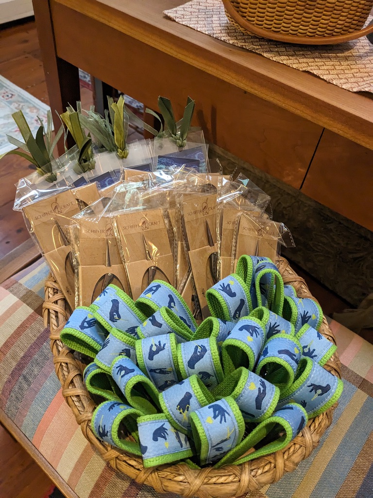 I had party favors! Key fobs made from ribbon and webbing from Renaissance Ribbons, cute stork scissors donated by Schiffer, and some bookmarks. Of course I looked for ribbon with weaving images, but this was the closest I could get. Everyone went home with some goodies.