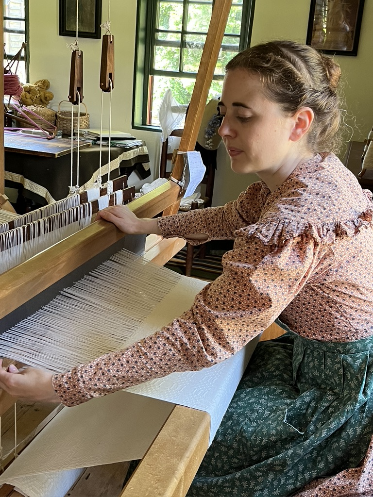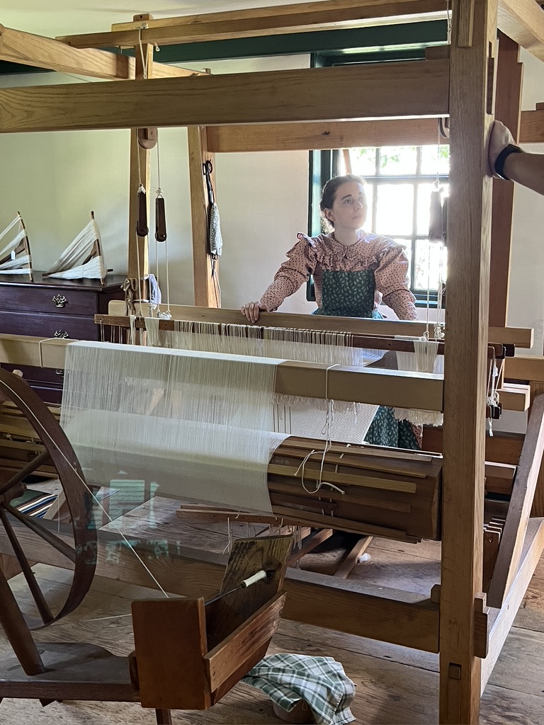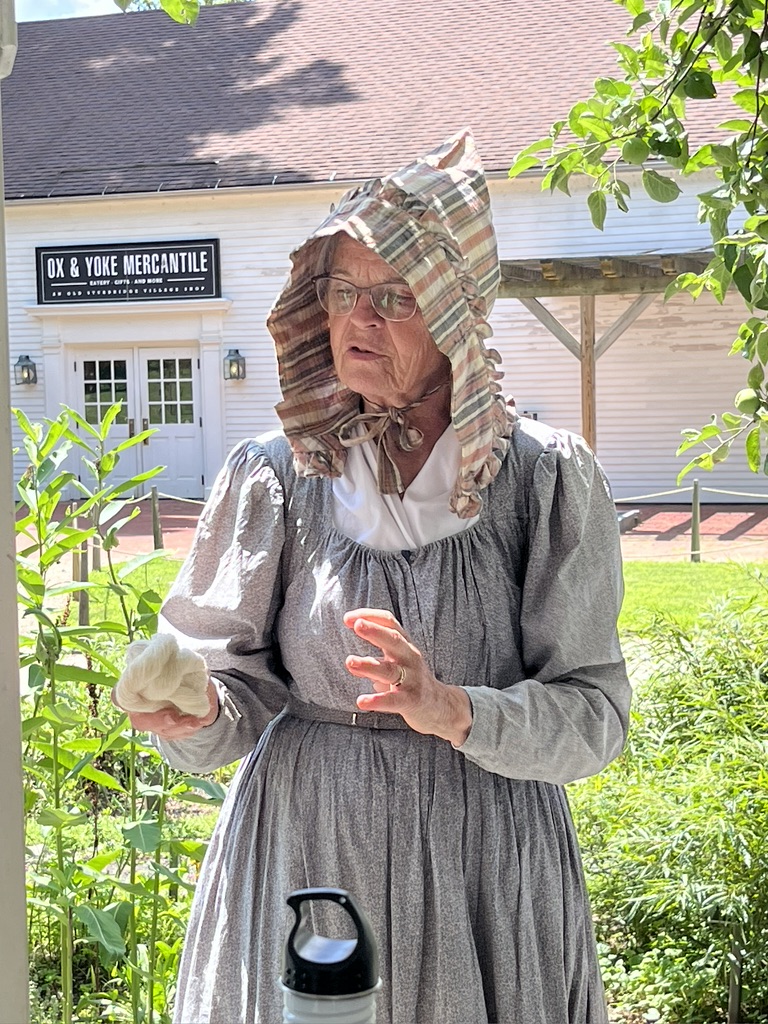 One thing I saw in the museum that she later talked about was milkweed silk. During this time period women with the luxury of time, or who could sell this product, made elegant wraps out of the fibers found in the seed pod of milkweed. You had to use it before the pods opened so that the silky fibers were still neatly nestled in the pod. Our gardening guide is making one herself. The fibers are bound together with sewing thread in little bundles and then attached to handwoven fabric.