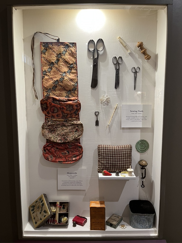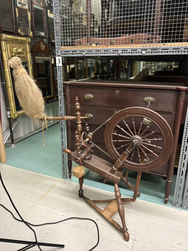 Upstairs in the collections building were lots of spinning wheels, wool winders and other tools. Our guide was particularly enthusiastic about a flax spinning wheel made by a man named Higginbotham who was from Pomfret, Connecticut and Cranston, Rhode Island, born in the mid 18th c. It is a still a beauty!