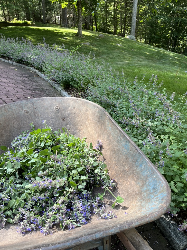 This week I cut all the flowers from the nepeta (catmint) and the lavender, hoping to get another flush of flowers in August. The bees were working just ahead of me as I cut the nepeta, and the scent was luscious. Lucky bees!
