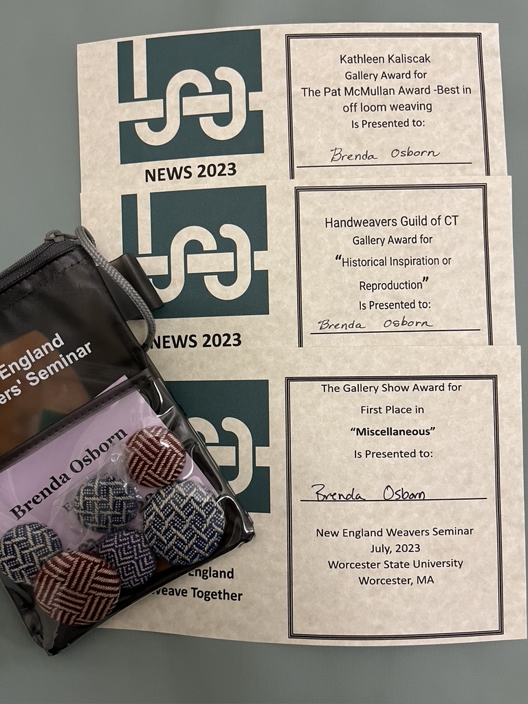 One of my baskets got three awards: 1st Place in Miscellaneous (I guess that’s the category for baskets!), and two special awards for ‘best historical inspiration’ and ‘best off-loom weaving.’ I am thrilled!