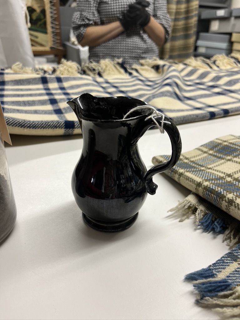 The museum has record books of payments for woven goods. The weavers were not always paid in currency at this time. This pitcher was payment for the blanket in the background, and there is a record that weaver was not happy with this outcome for her work. The blanket is all wool, with indigo dyed stripes. It is quite large, and pitcher is not!