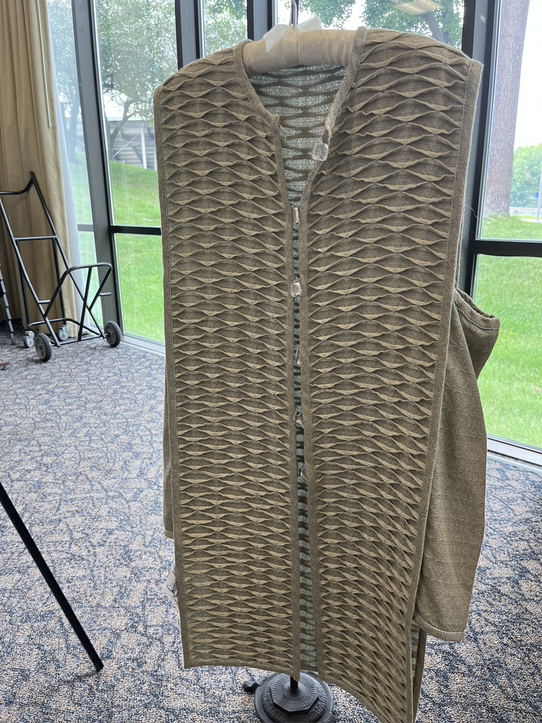 The most moving tribute (for me) was to Sarah Fortin. She passed away far too soon, and she left me marveling at many of the techniques she used. I didn’t know her well, but one workshop I took with her will always be a high spot in my weaving history. I regret that I don’t have a photograph of her tribute board. I guess I was too busy reacting to the loss of her. But here is one of her wonderful dimensional fabrics. She was also a talented sewist.
