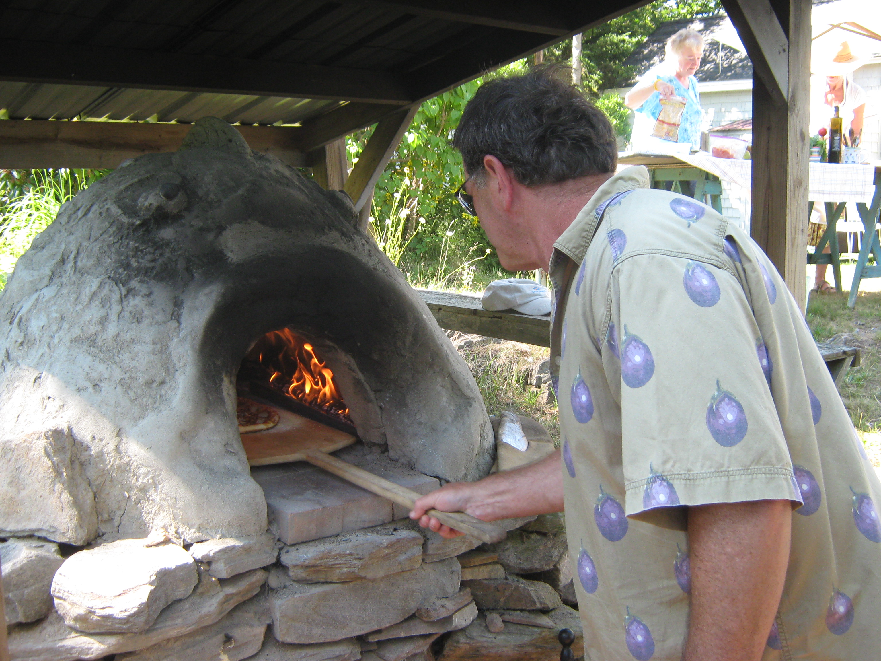On a more positive note…. we went to a party on Bailey’s Island, as guests of guests. Our host Paul built a mud oven shaped like a fish with its mouth wide open to accept his culinary creations.  He made 32 pizzas that day!  Delightful combinations like pear and gorgonzola, eggplant and green salsa….even a couple of dessert pizzas with chocolate chunks, marmallows and strawberries!  I think there will be a mud oven in our future at home!