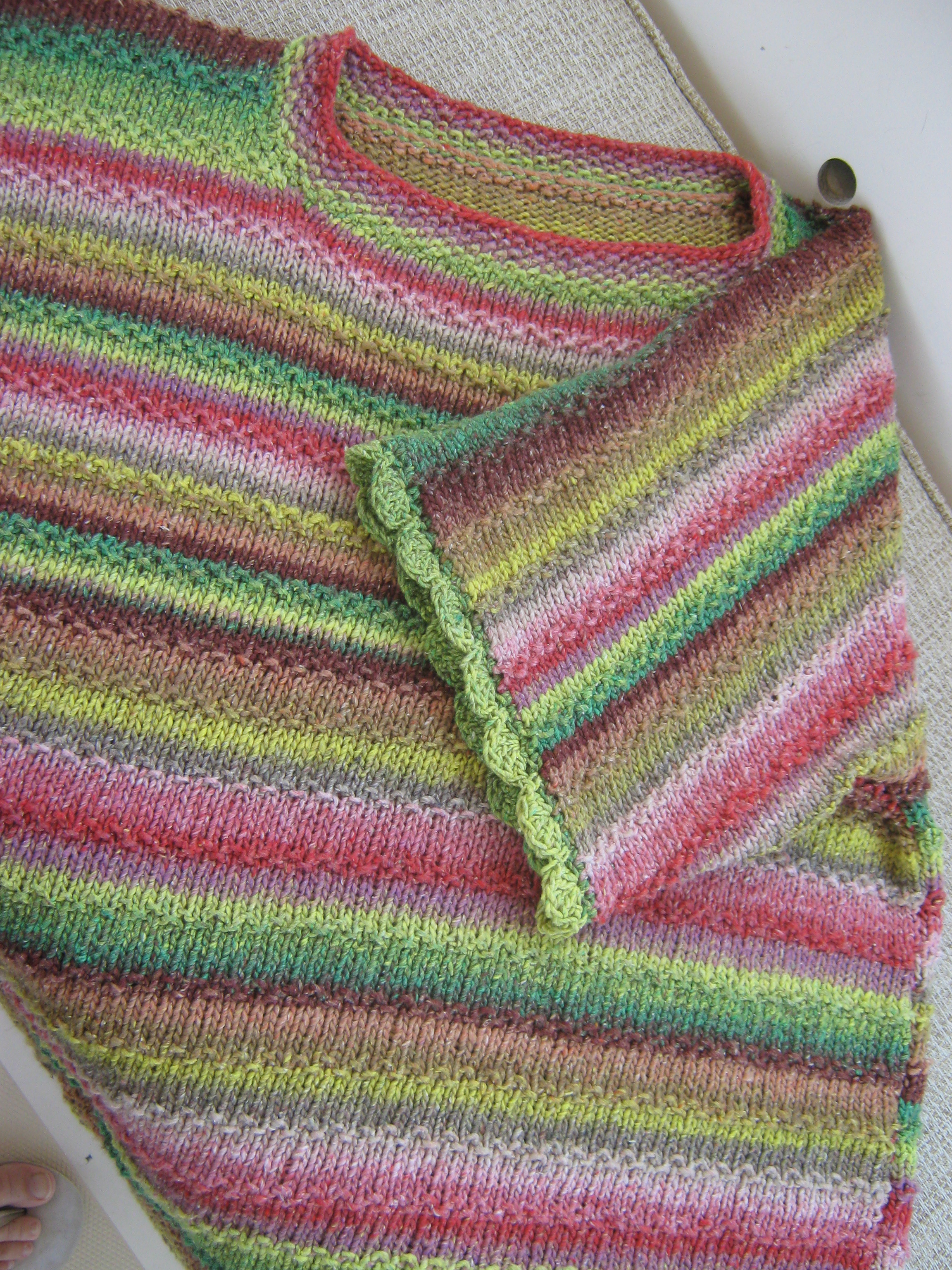 My biggest gripe is the look of the sleeves in the cover photo.  They are clearly 3/4 sleeves.  The pattern knits up as short sleeves.  The pattern does say that if you want shorter or longer sleeves you must adjust your stitch number to achieve this.  The pattern says that the stitches called for in the instructions will result in elbow length sleeves, but it does not say whether that includes the seed stitch border.  To me the sleeves in the cover are elbow length before the seed stitch border was added, so I presumed that the pattern photo showed the sweater knitted to the specifications in the basic pattern.  Wrong. The finsihed sweater looks decidedly dumpy with the short sleeves.  I tried the seed stitch border and didn’t like it.  So I ripped it out and tried a crocheted scallop, also dumpy, as the photo shows!  I cannot just do the sleeves over, making them longer, since the entire sweater is knit in one piece, from the bottom of the front all the way to the bottom of the back, increasing for the sleeves and working the neck as you go.  This would basically mean knitting the sweater again from almost the beginning.  A little note in the instructions saying that the sleeves in the photo had been lengthened would have helped immensely!  But still, I don’t know if I could carry off those bright horizontal stripes, so I’m not too enthusiastic about doing this sweater again anyway!
