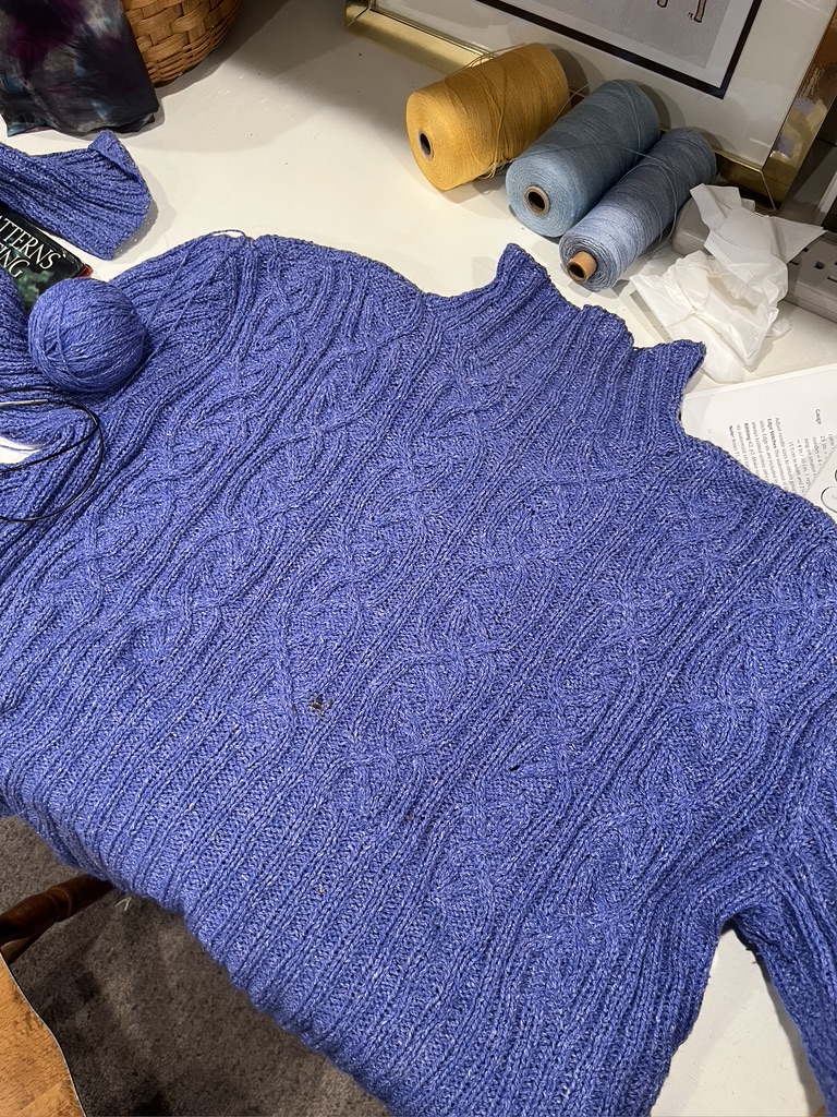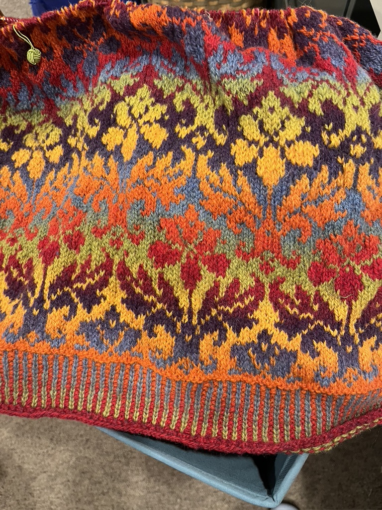 Amazingly, the yarn specified is the same gauge as my Portuguese yarn, and the same color. This was too good to be true, so I immediately cast on and am now almost ready to put the sleeve stitches on a holder and continue with the body. The top down shaping is unique and was fun to do! And didn’t I find a cute yarn holder when I bought this yarn.