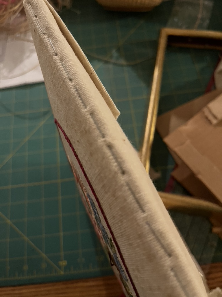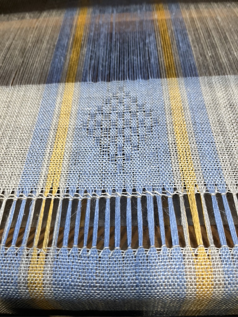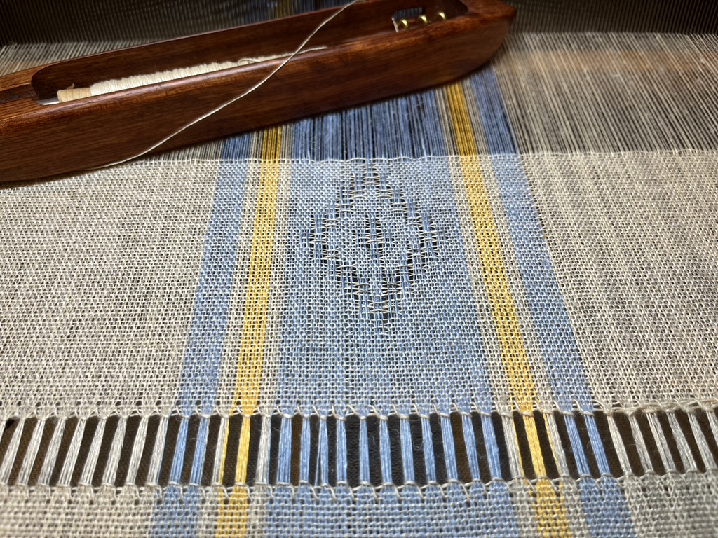 The weft loop runner is quite long, with the loop design at both ends of the runner. I think I will turn it into a long bolster pillow for our bed at home, which has a machine woven coverlet made at the American Textile Museum when they were still in operation. I think the runner is as wide as our bed.